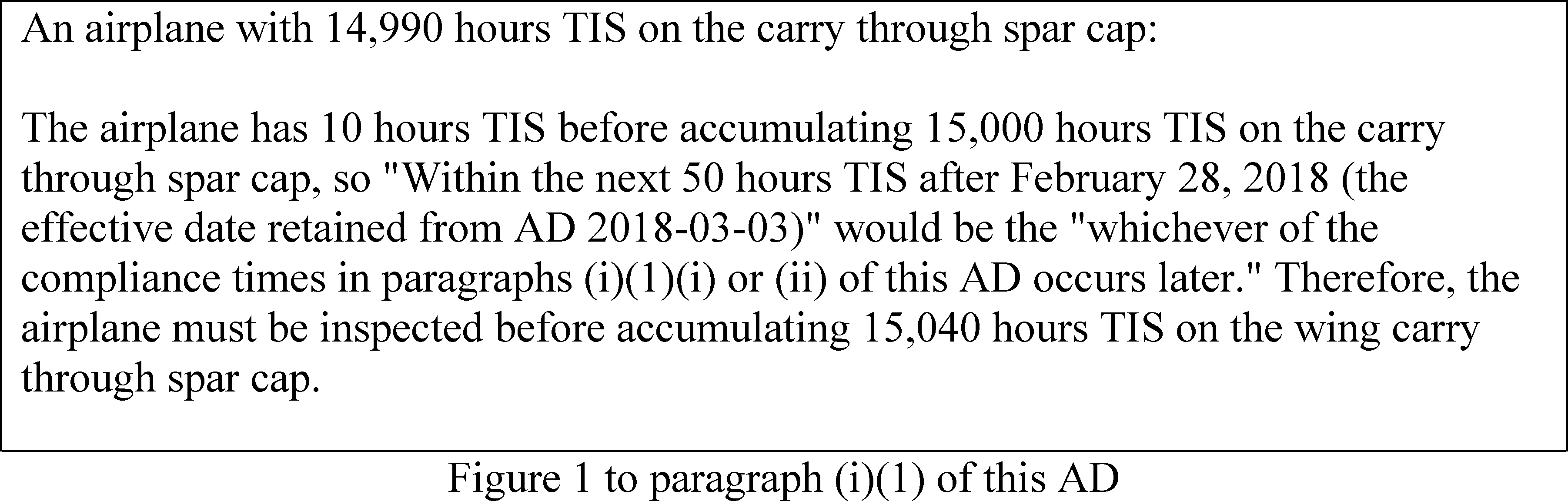 initially inspect before or upon accumulating 15,000 hours TIS on the newly installed carry through spar cap and repetitively thereafter inspect at intervals not to exceed 50 hours TIS.