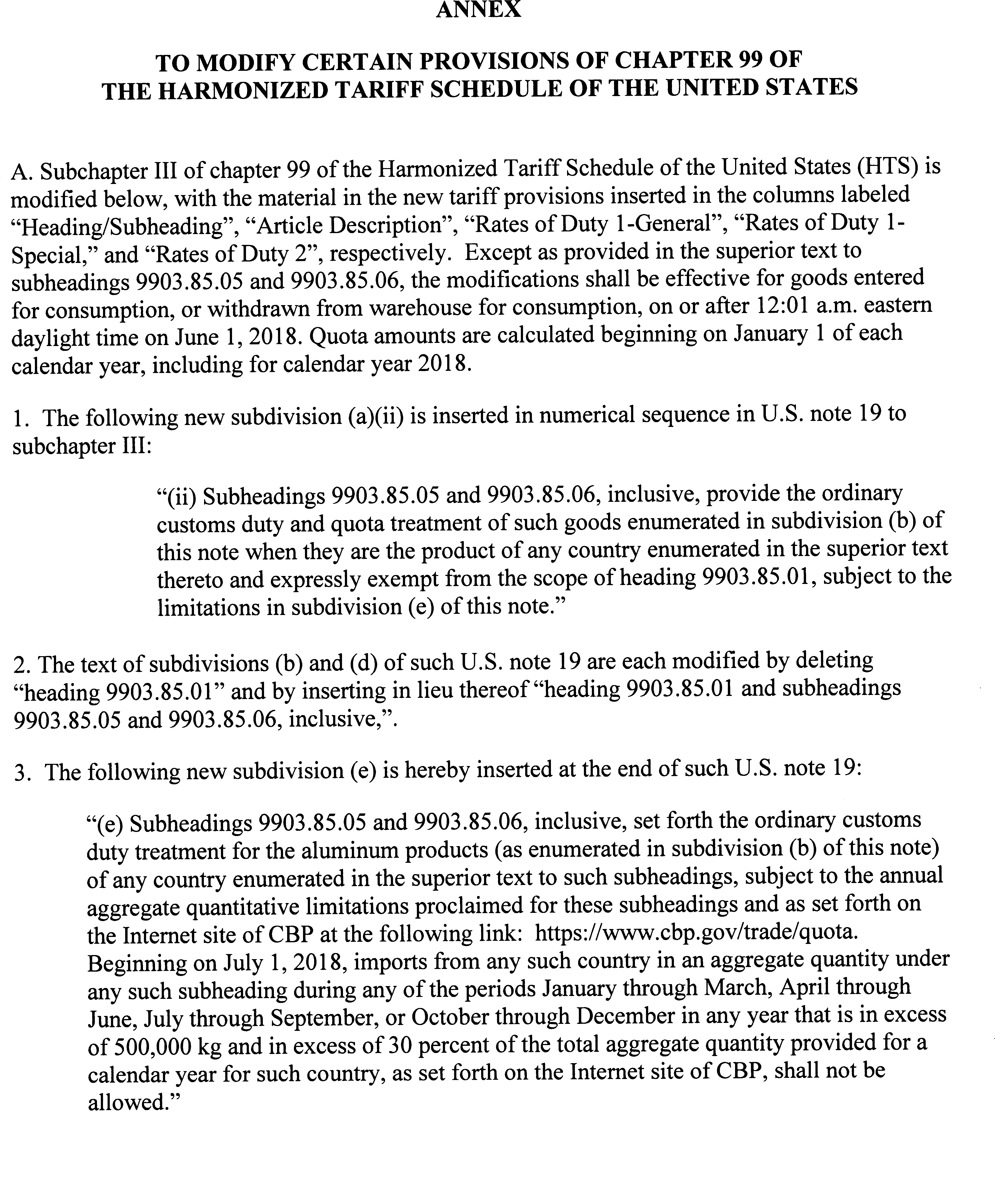 (2) In order to implement a quota treatment on aluminum articles imports from Argentina, U.S. note 19 to subchapter III of chapter 99 of the HTSUS is amended as provided for in Part A of the Annex to this proclamation. U.S. Customs and Border Protection (CBP) of the Department of Homeland Security shall implement this quota as soon as practicable, taking into account all aluminum articles imports from this country since January 1, 2018. ( printed page 25851)