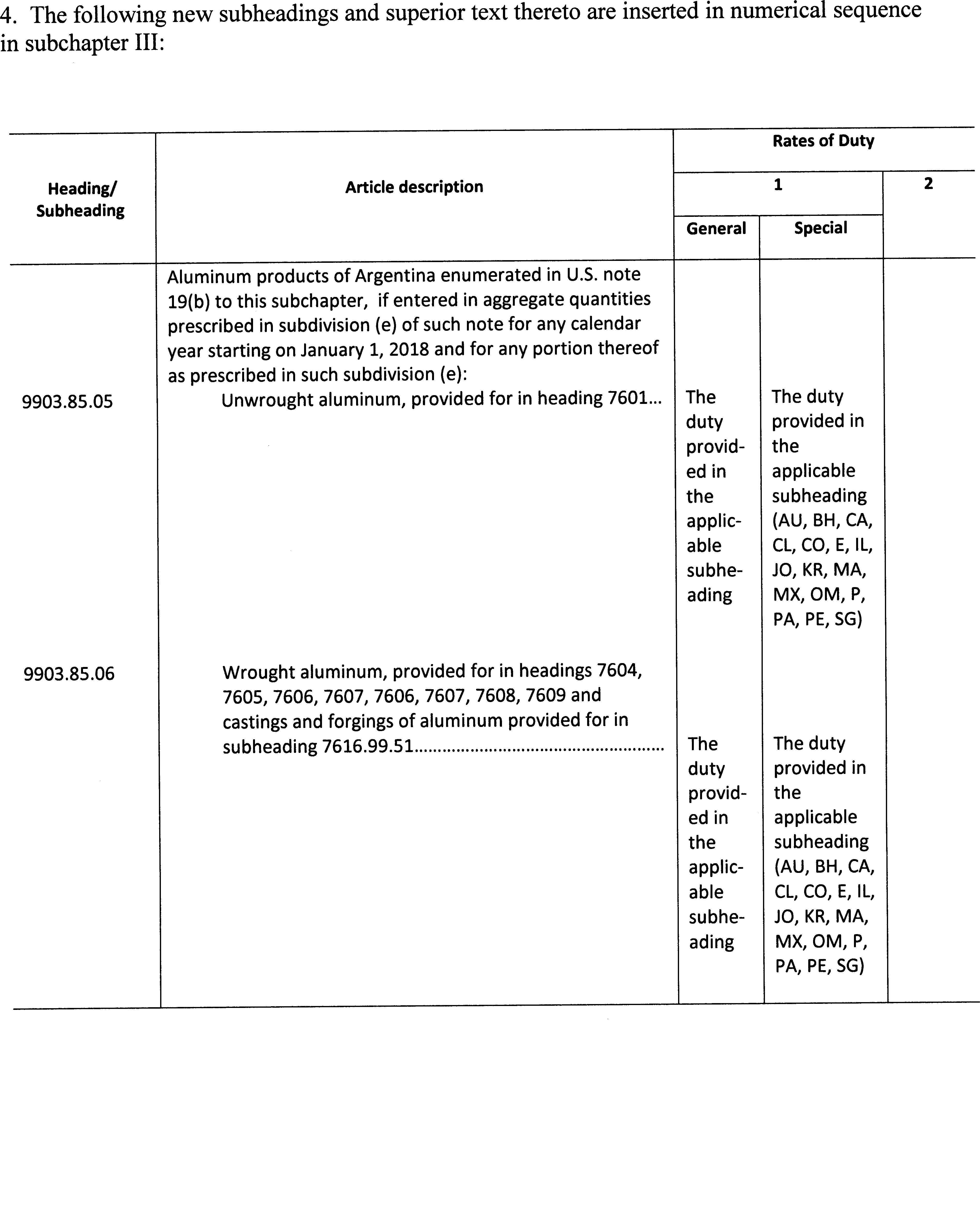 (4) For the purposes of administering the quantitative limitations applicable to subheadings 9903.85.05 through 9903.85.06 for Argentina, the annual aggregate limits set out in Part B of the Annex to this proclamation shall apply for the period starting with calendar year 2018 and for subsequent years, unless modified or terminated. The quantitative limitations applicable to subheadings 9903.85.05 through 9903.85.06 for Argentina, which for calendar year 2018 shall take into account all aluminum articles imports from Argentina since January 1, 2018, shall be effective for aluminum articles entered for consumption, or withdrawn from warehouse for consumption, on or after June 1, 2018, and shall be implemented by CBP as soon as practicable, consistent with the superior text to subheadings 9903.85.05 through 9903.85.06. The Secretary of Commerce shall monitor the implementation of the quantitative limitations applicable to subheadings 9903.85.05 through 9903.85.06 and shall, in consultation with the Secretary of Defense, the United States Trade Representative, and such other senior Executive Branch officials as the Secretary deems appropriate, inform the President of any circumstance that in the Secretary's opinion might indicate that an adjustment of the quantitative limitations is necessary.