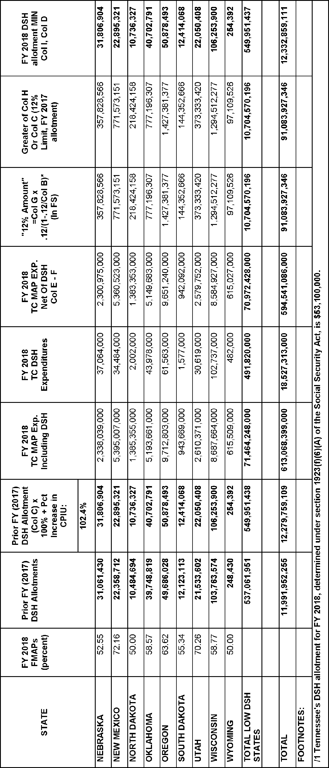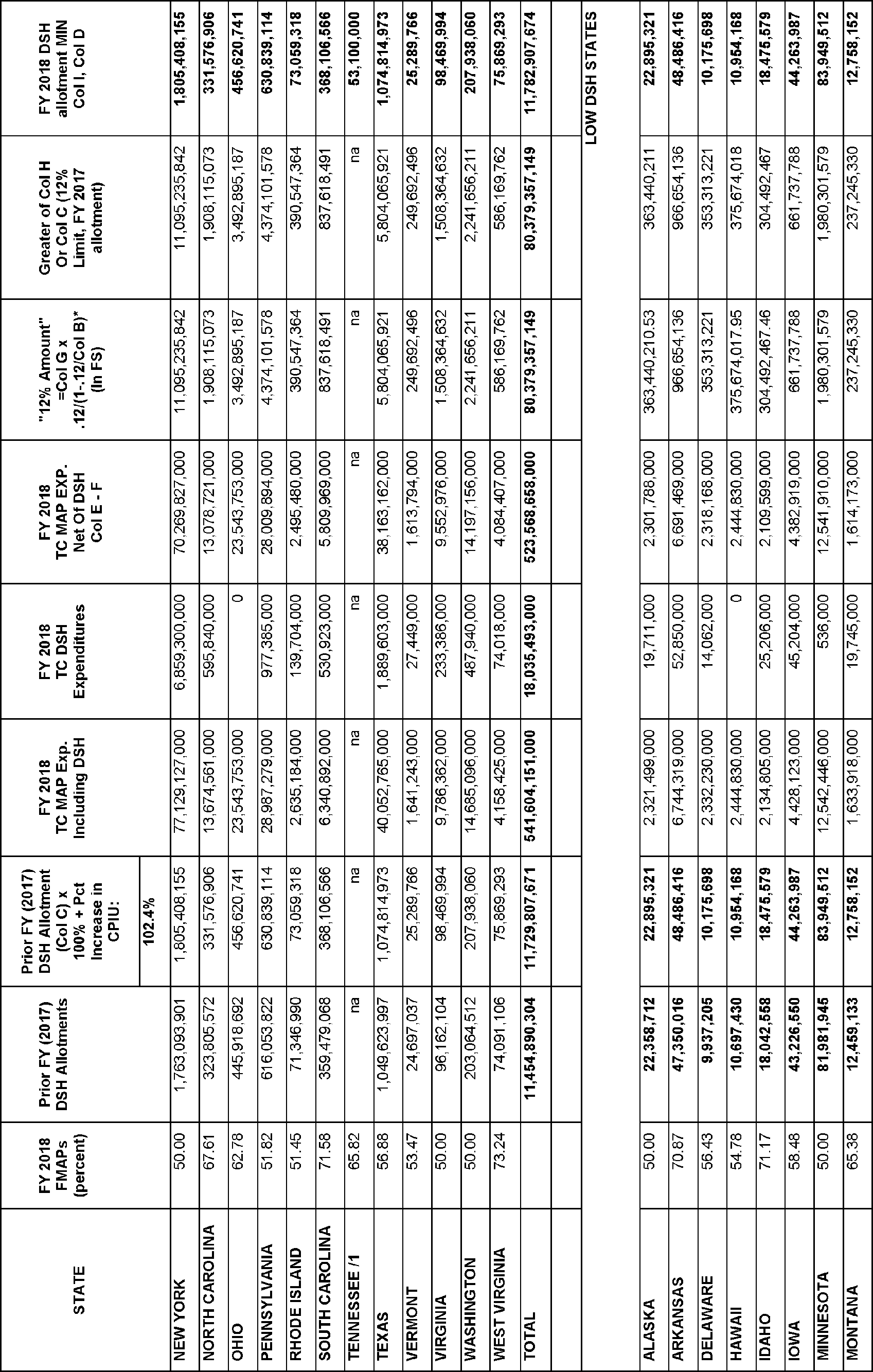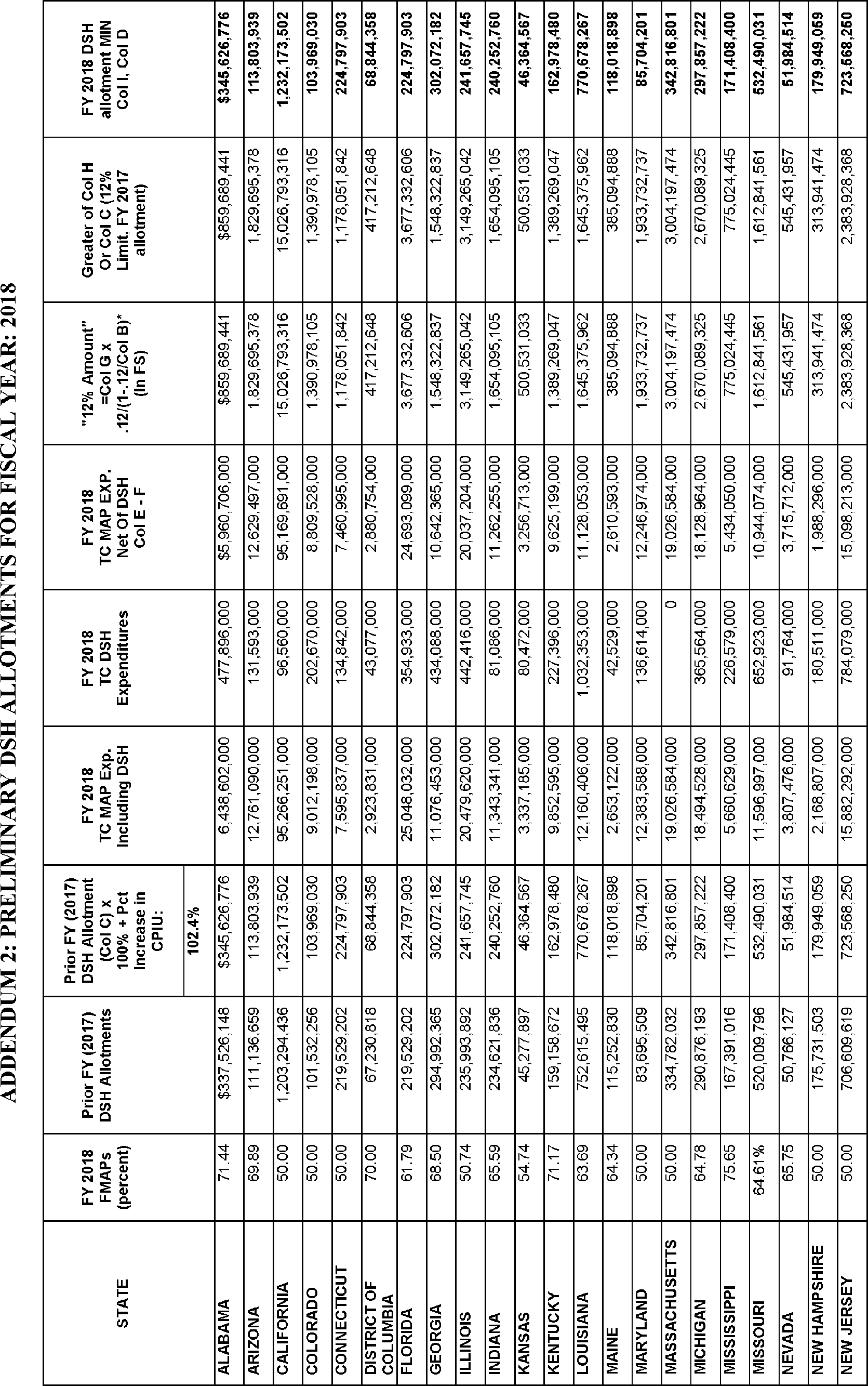 The Preliminary FY 2018 DSH Allotments for the NON-Low DSH States are presented in the top section of this addendum, and the Preliminary FY 2018 DSH Allotments for the Low-DSH States are presented in the bottom section of this addendum.