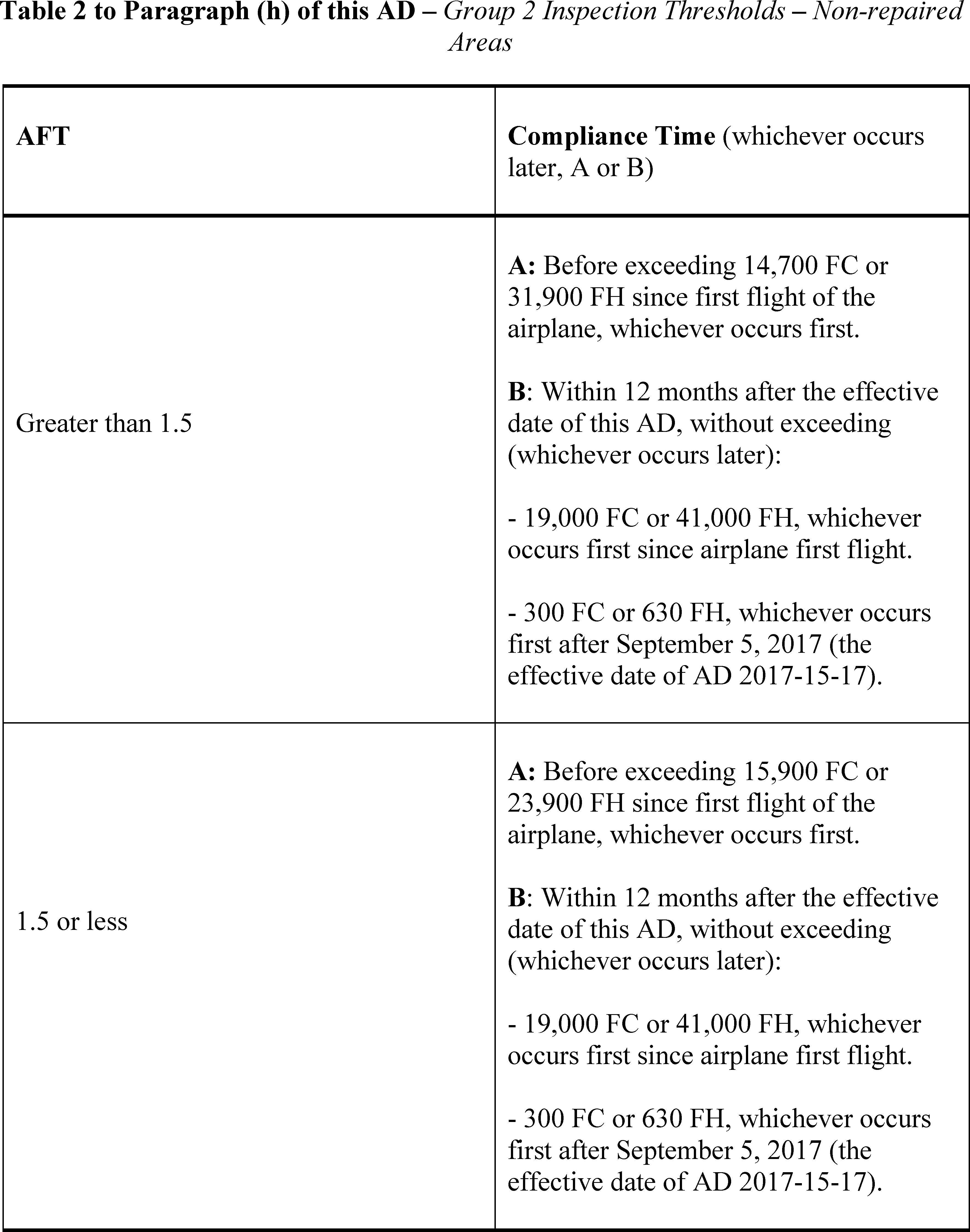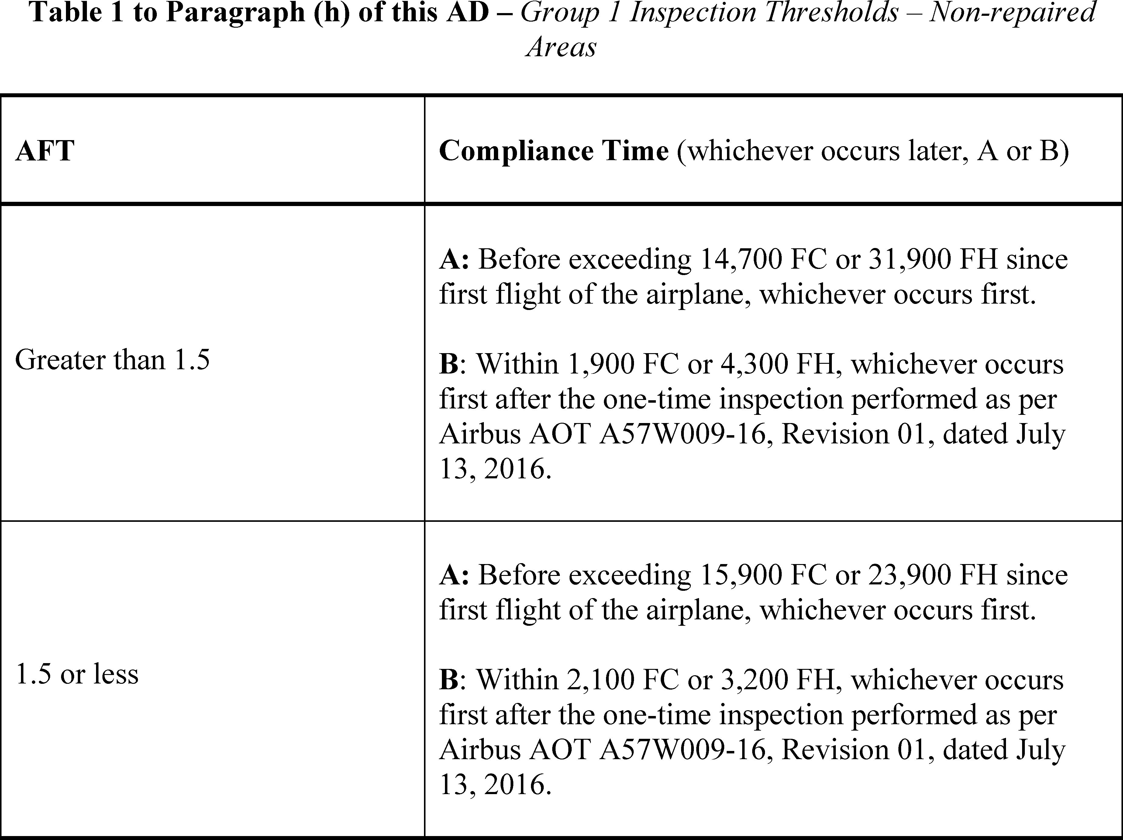 (2) For the purpose of this AD, Group 1 airplanes are those airplanes already inspected in accordance with paragraph 4.2.2 in Alert Operators Transmission (AOT) A57W009-16, Revision 01, dated July 13, 2016, before the effective date of this AD. Group 2 airplanes are those airplanes not inspected in accordance with paragraph 4.2.2 in AOT A57W009-16, Revision 01, dated July 13, 2016, as of the effective date of this AD.