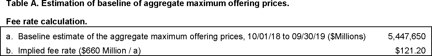 To make the baseline estimate of the aggregate maximum offering price for fiscal year 2019, the Commission is using a methodology that has been used in prior fiscal years and that was developed in consultation with the Congressional Budget Office and Office of Management and Budget.[6] Using this methodology, the Commission determines the “baseline estimate of the aggregate maximum offering price” for fiscal year 2019 to be $5,447,649,888,566. Based on this estimate, the Commission calculates the fee rate for fiscal 2019 to be $121.20 per million. This adjusted fee rate applies to Section 6(b) of the Securities Act, as well as to Sections 13(e) and 14(g) of the Exchange Act.