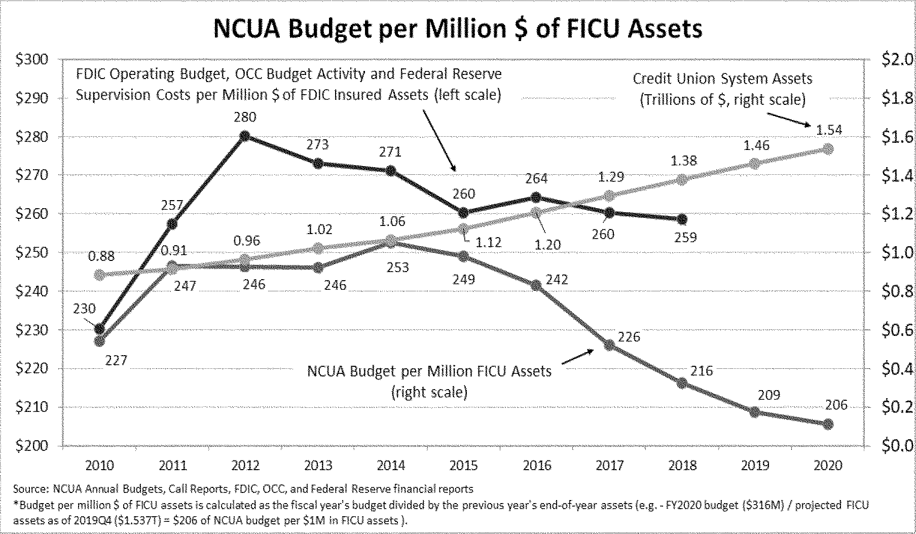 In addition, as shown in the chart below, the relative size of the NCUA budget (red line) continues to decline when compared to balance sheets at federally-insured credit unions (gray line). This trend illustrates the greater operating efficiencies the NCUA has attained in the last several years. Additionally, the NCUA has improved its operating efficiencies more aggressively than other financial industry regulators (red line compared to blue line).