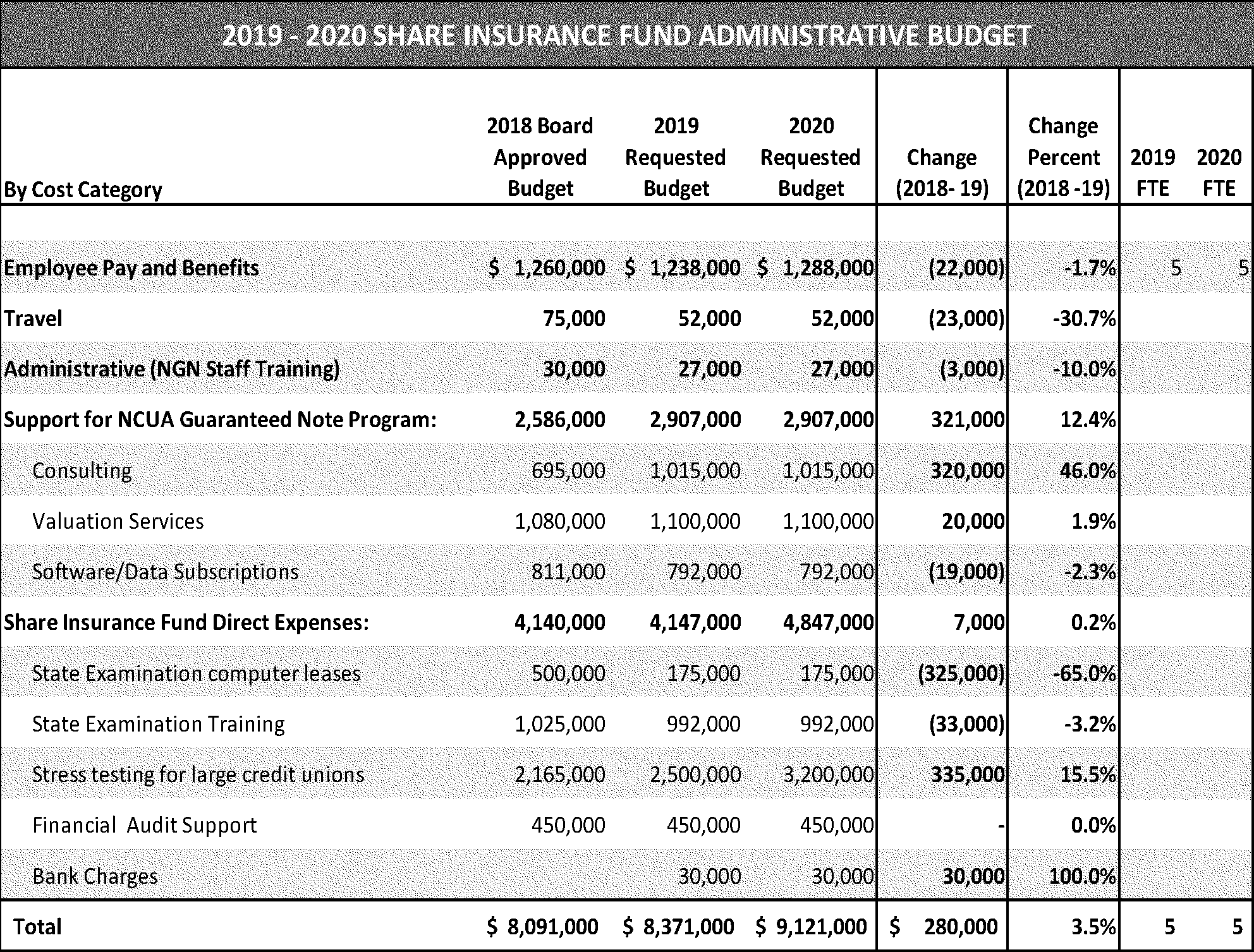 The proposed 2019 Share Insurance Fund Administrative budget is $8.4 million.