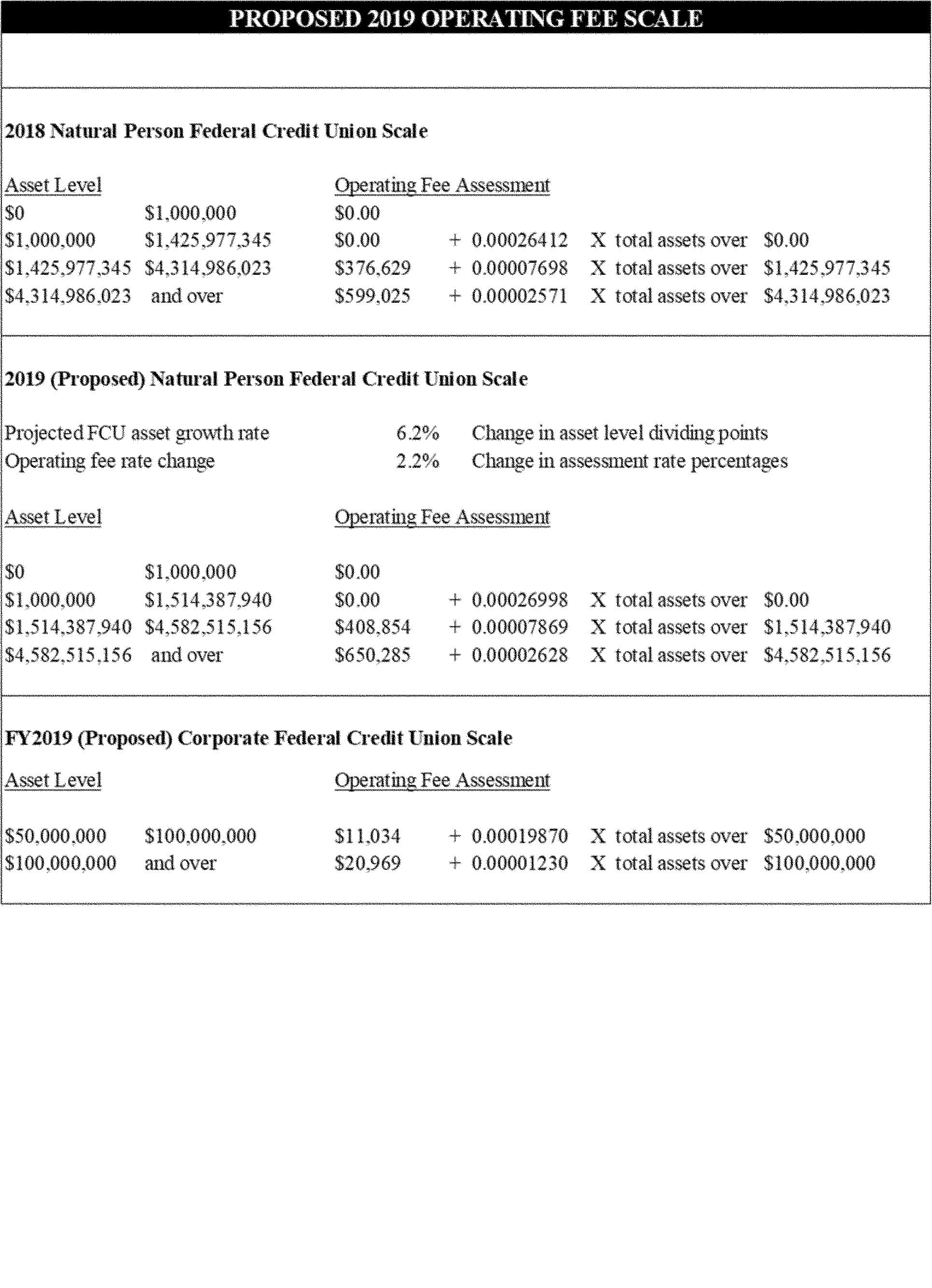 The Operating Fee will be assessed to federal credit unions based on estimated year-end assets. Credit unions with assets less than $1 million will not be assessed an Operating Fee. To set the assessment scale for 2019, federal credit union asset growth will be projected through December 31, 2018. Based on the June 30, 2018, Call Report data, annual growth is projected to be 6.2 percent at year end. The asset level dividing points will be increased by this same projected growth rate. Assets are indexed annually to preserve the same relative relationship of the scale to applicable asset base.