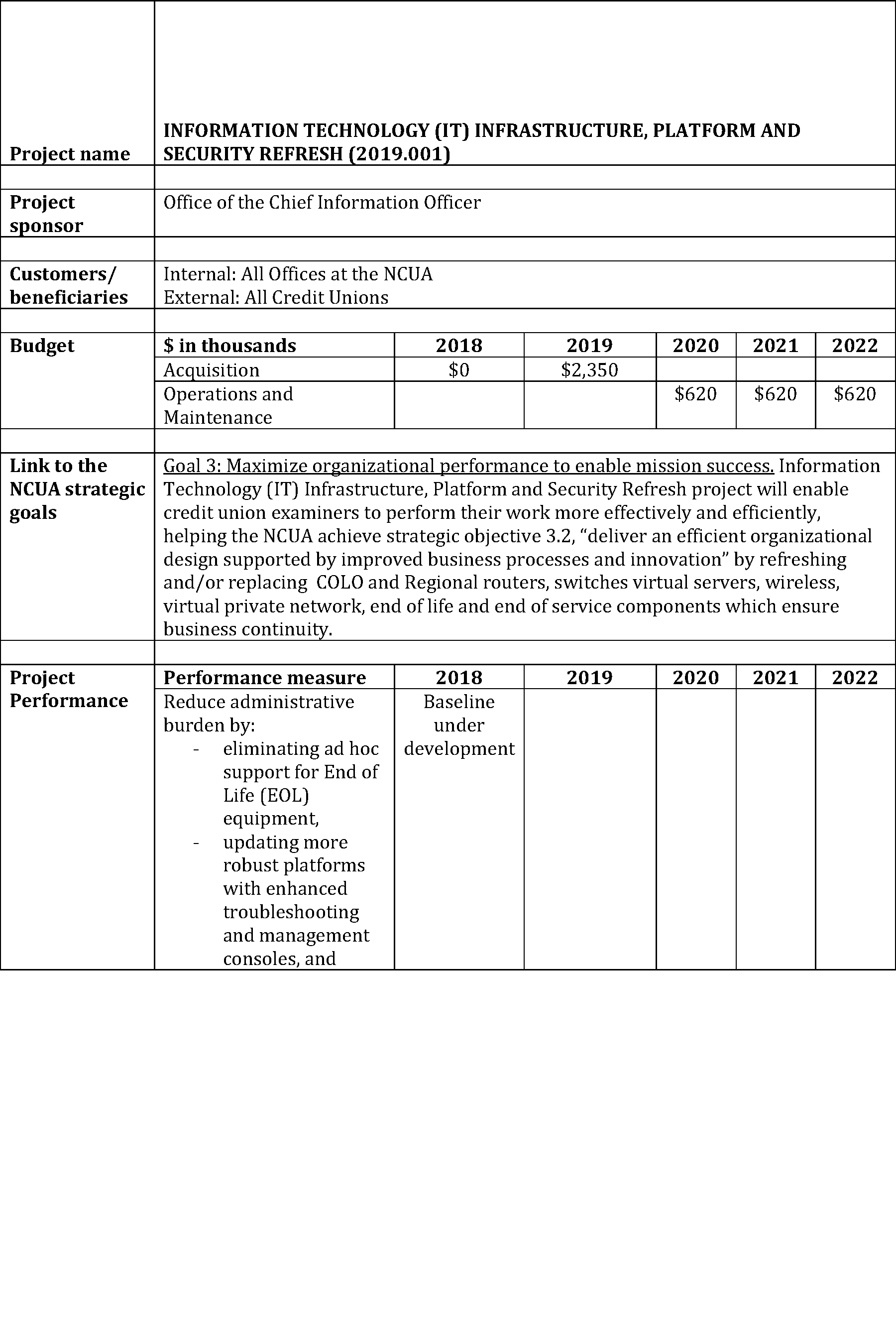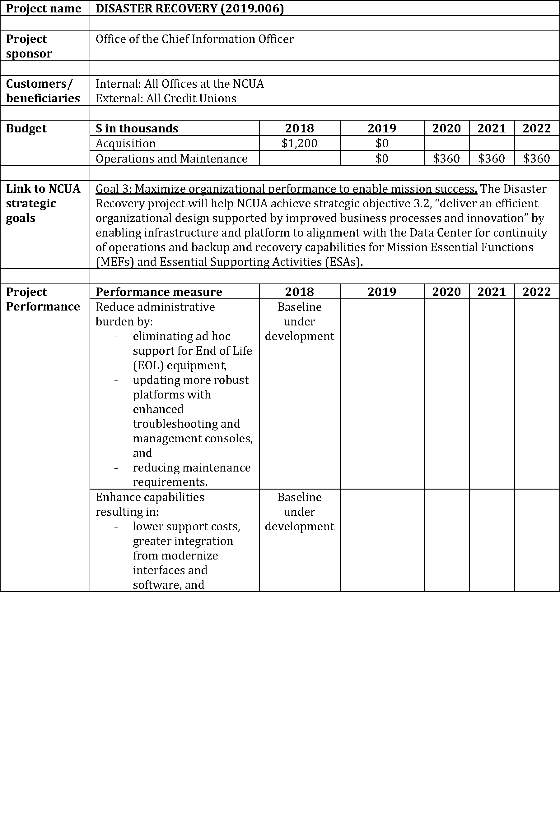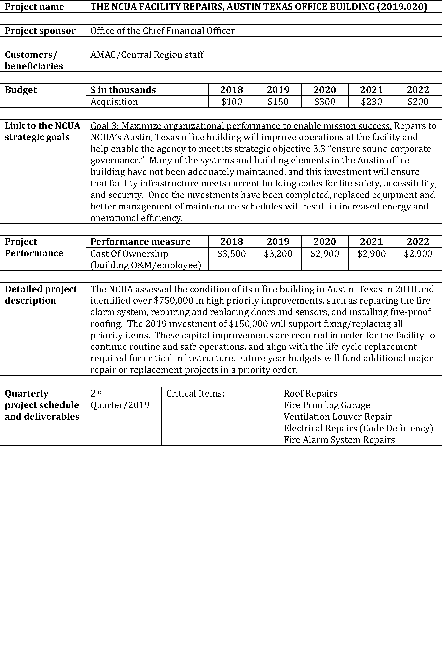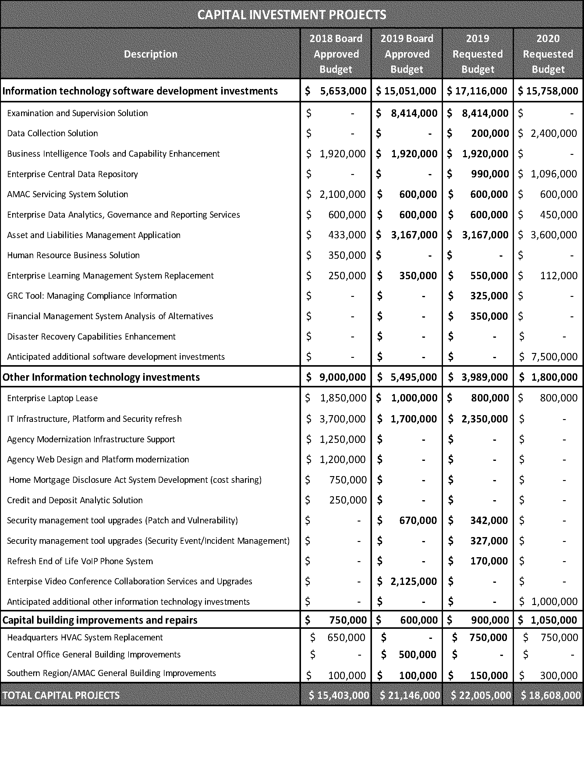 The Capital Budget pays for continued investments in technology and infrastructure projects, as well as several new initiatives that will start in 2019, including a replacement of the agency's antiquated AIRES examination software, which is used by both federal and state examiners in almost all credit union examinations. The NCUA's Information Technology Prioritization Council recommended $17.1 million for IT software development projects that continue to replace the NCUA's decades-old and functionally obsolete information technology systems, and $4 million in other IT investments for 2019. The NCUA facilities require $0.9 million in capital investments.