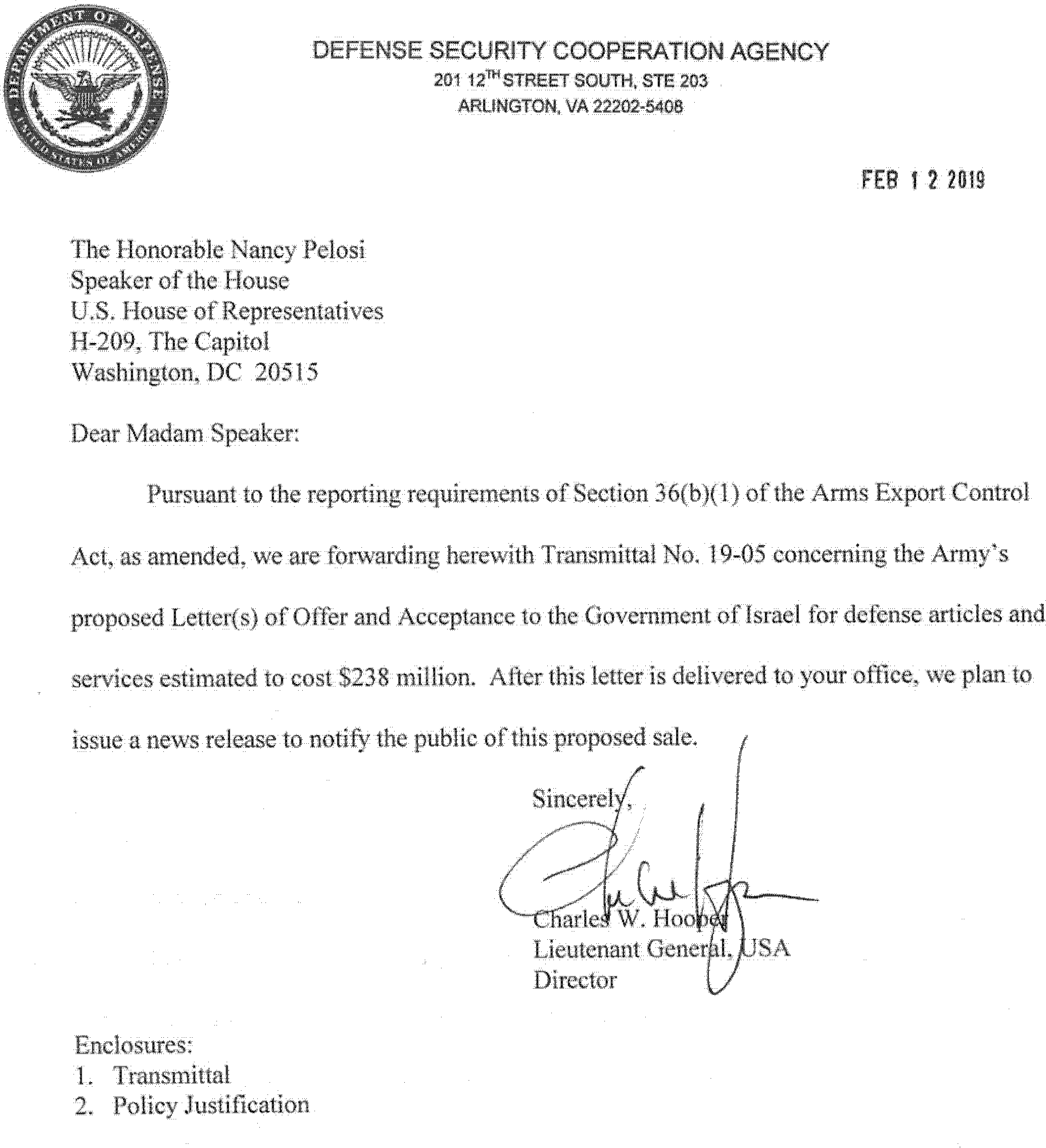 This 36(b)(1) arms sales notification is published to fulfill the requirements of section 155 of Public Law 104-164 dated July 21, 1996. The following is a copy of a letter to the Speaker of the House of Representatives, Transmittal 19-05 with attached Policy Justification.