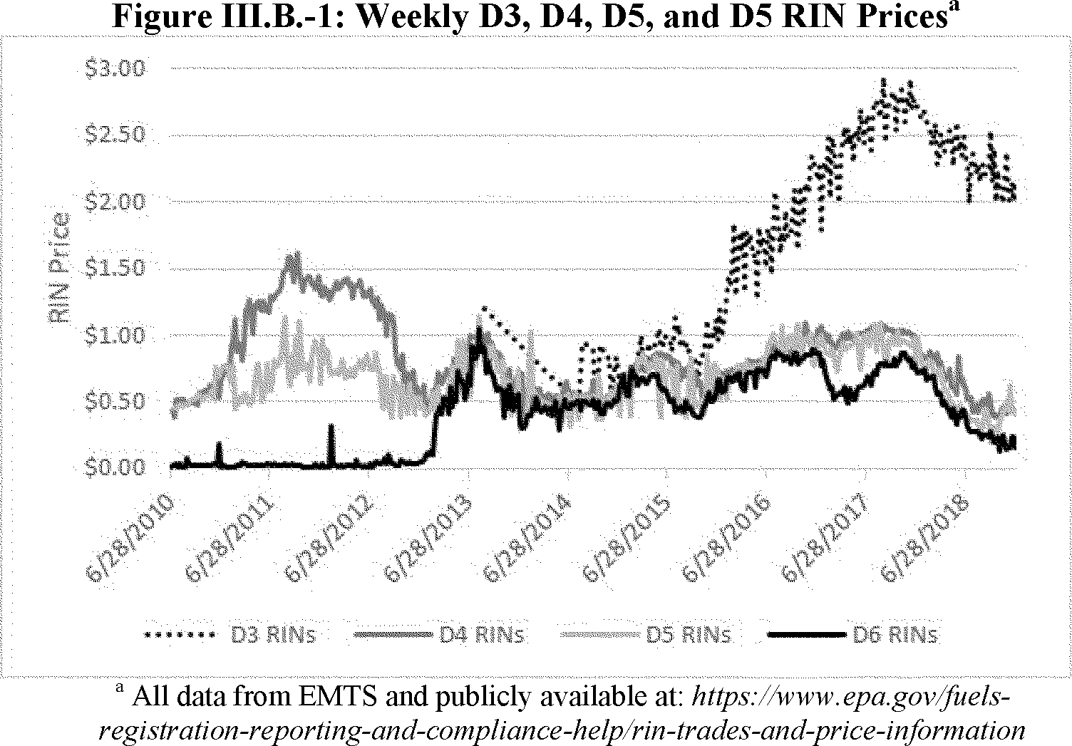 Until 2013, the price for D6 (conventional biofuel) RINs, the vast majority of which were generated for ethanol produced from corn starch, was negligible (See Figure III.B-1). The Volumetric Ethanol Excise Tax Credit was also available to ethanol blenders through 2011.
