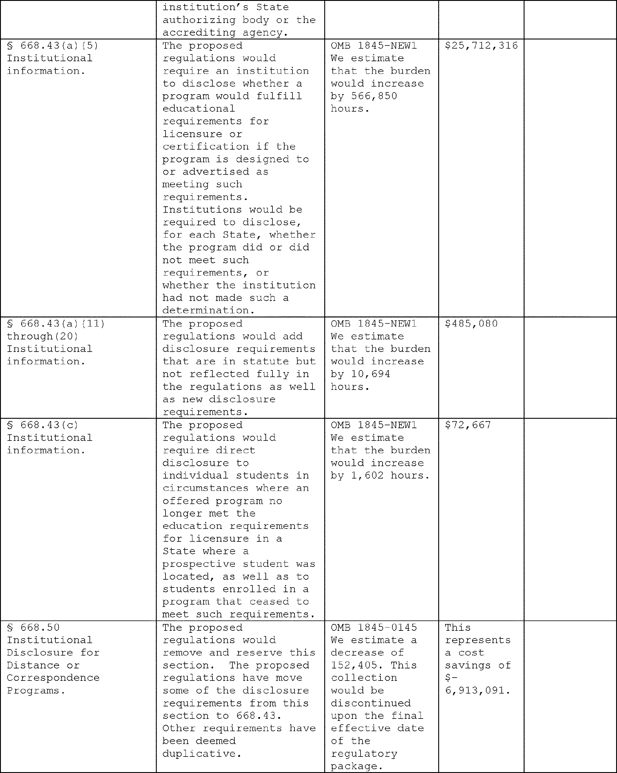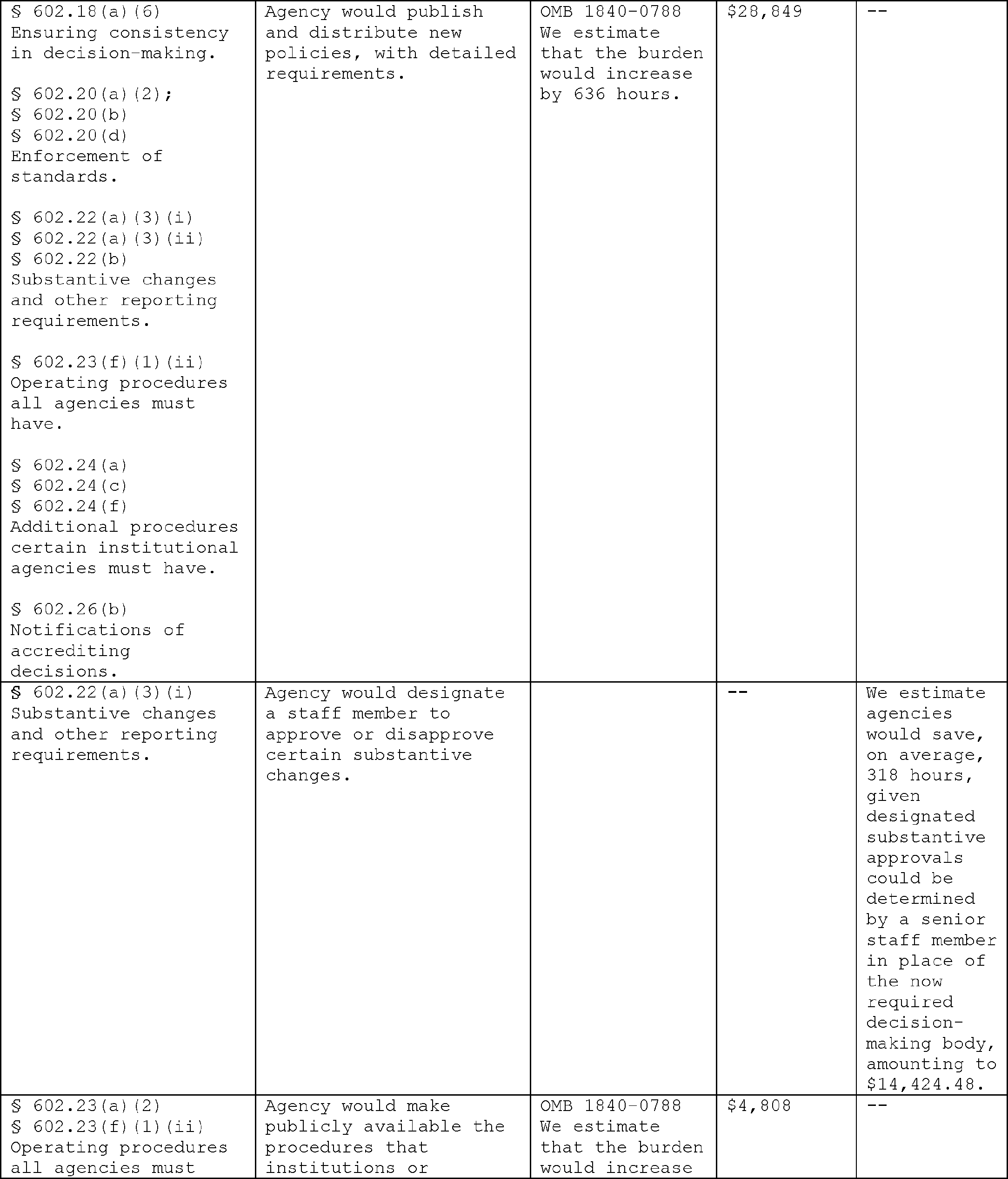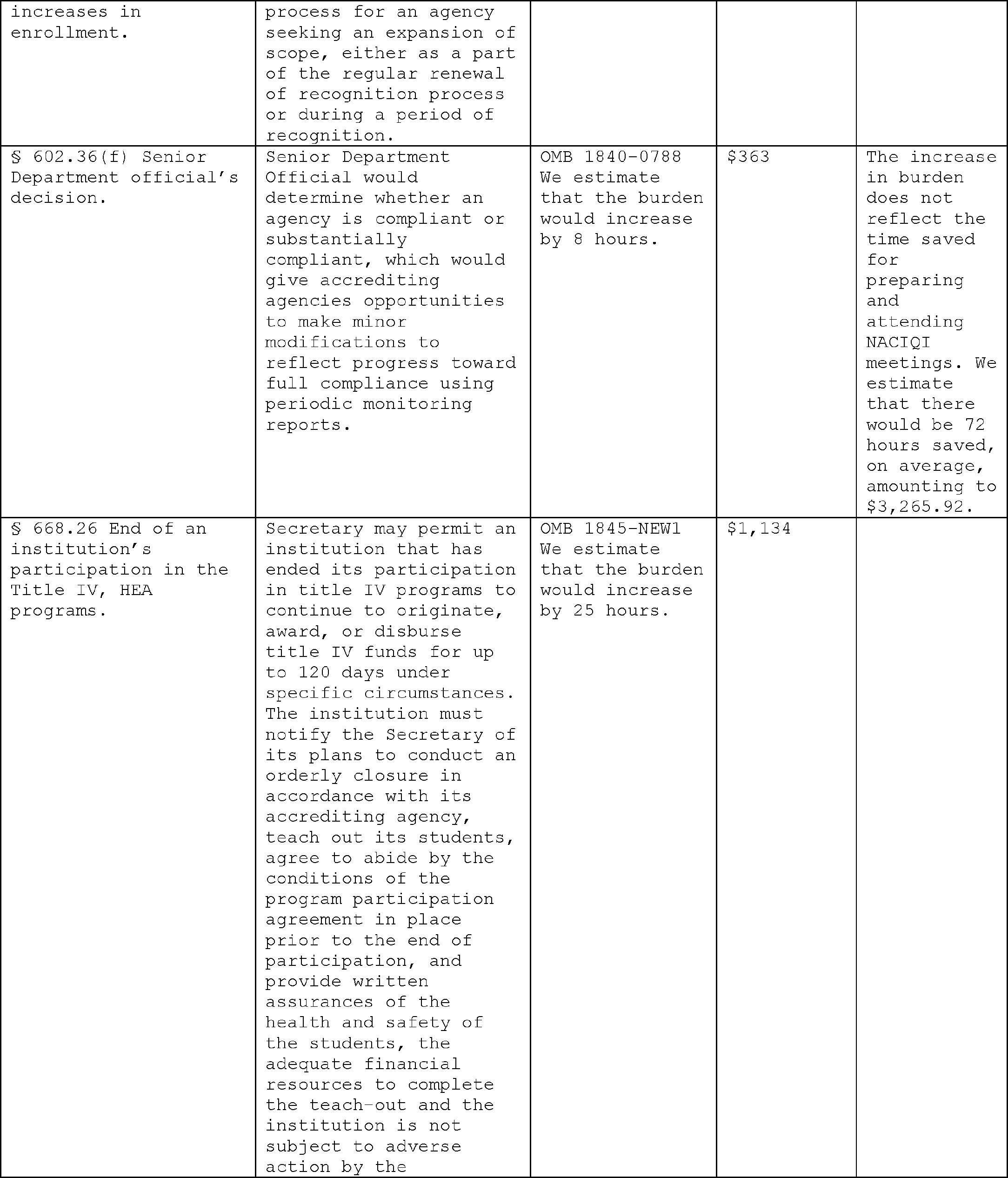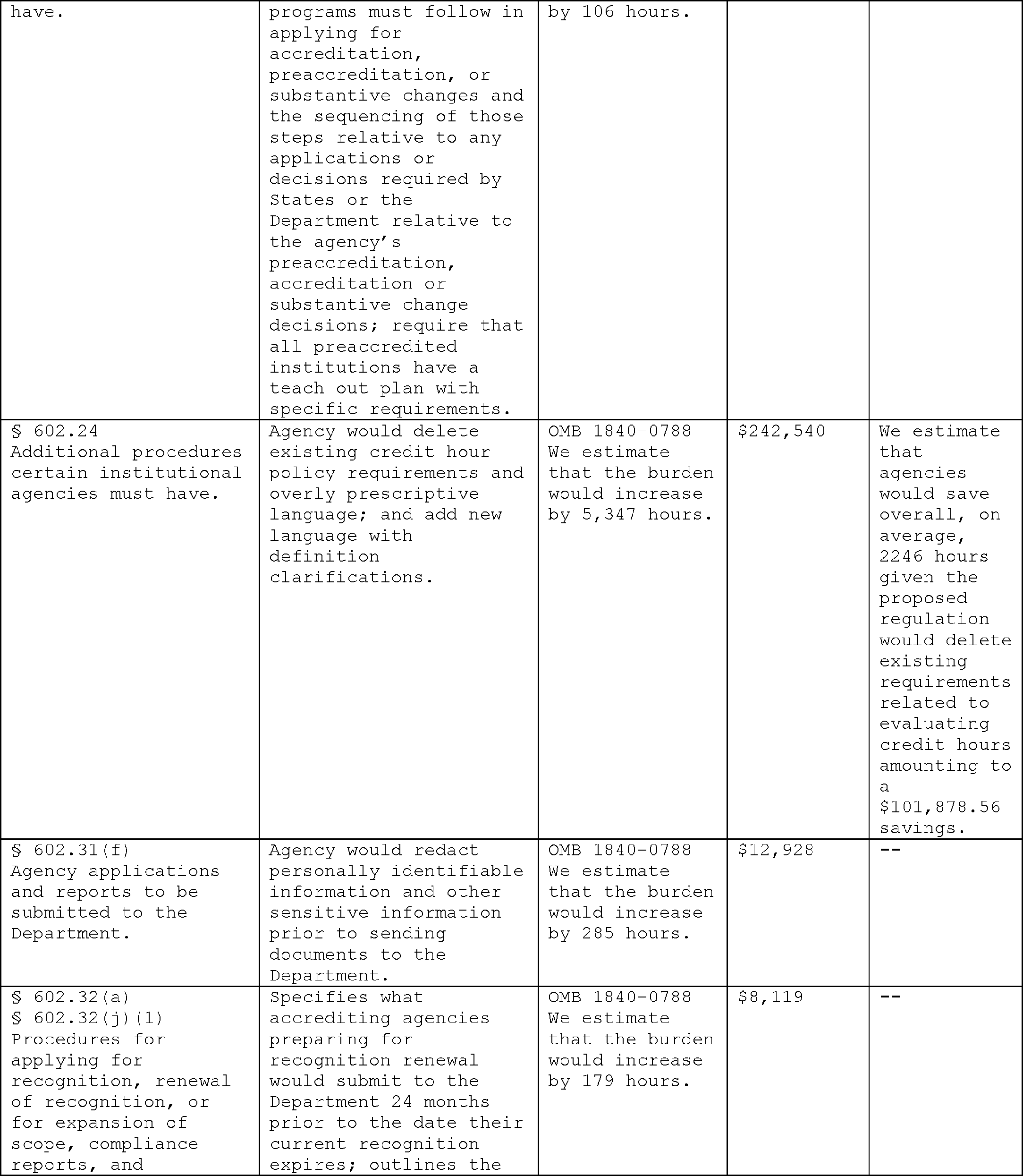 teach-outs for students at closed or closing schools, improving outcomes, and restoring public trust in the rigor of the accreditation process and the value of postsecondary education. The potential costs associated with the proposed regulations include some burden associated with required disclosures and developing polices about accreditation decision-making, enforcement of standards, and substantive change reporting requirements. While not the anticipated outcome, it is possible agencies would utilize reduced regulatory burden without redeploying resources towards greater oversight of institutions. However, the more likely scenario is that this regulation will actually reduce the need to hire outside firms to prepare materials for submission to the Department. Increased competition among accreditors could have the unintended consequence of encouraging some accreditors to lower standards. It is therefore incumbent on the Department and NACIQI to utilize new accountability and oversight tools provided for in these regulations to properly monitor agencies and mitigate these risks.