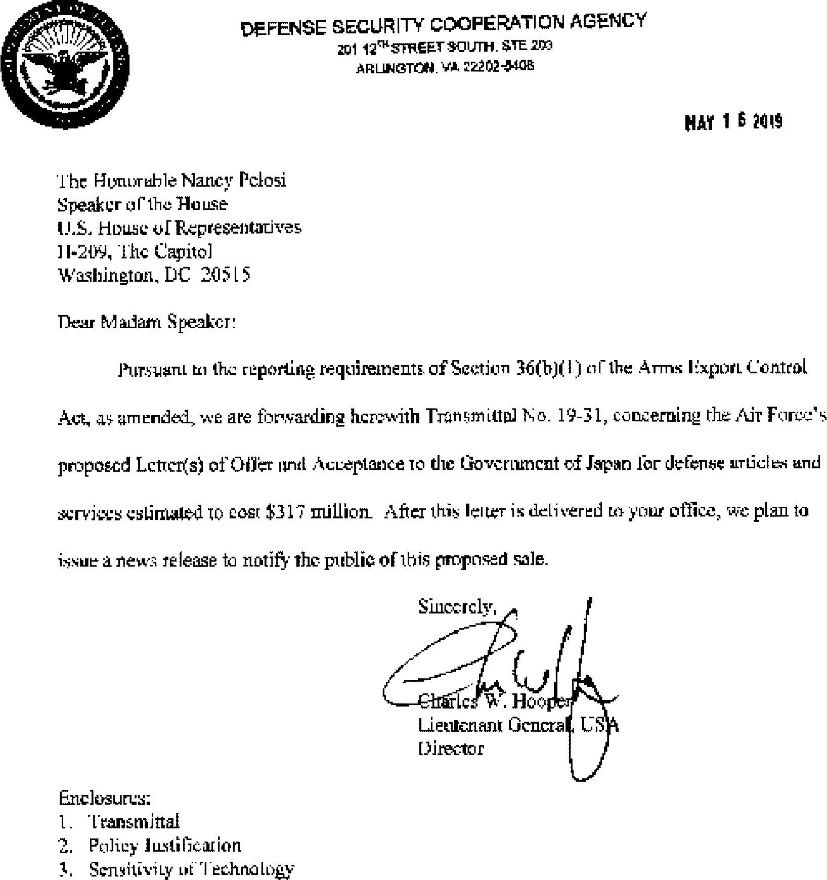 This 36(b)(1) arms sales notification is published to fulfill the requirements of section 155 of Public Law 104-164 dated July 21, 1996. The following is a copy of a letter to the Speaker of the House of Representatives, Transmittal 19-31 with attached Policy Justification and Sensitivity of Technology.
