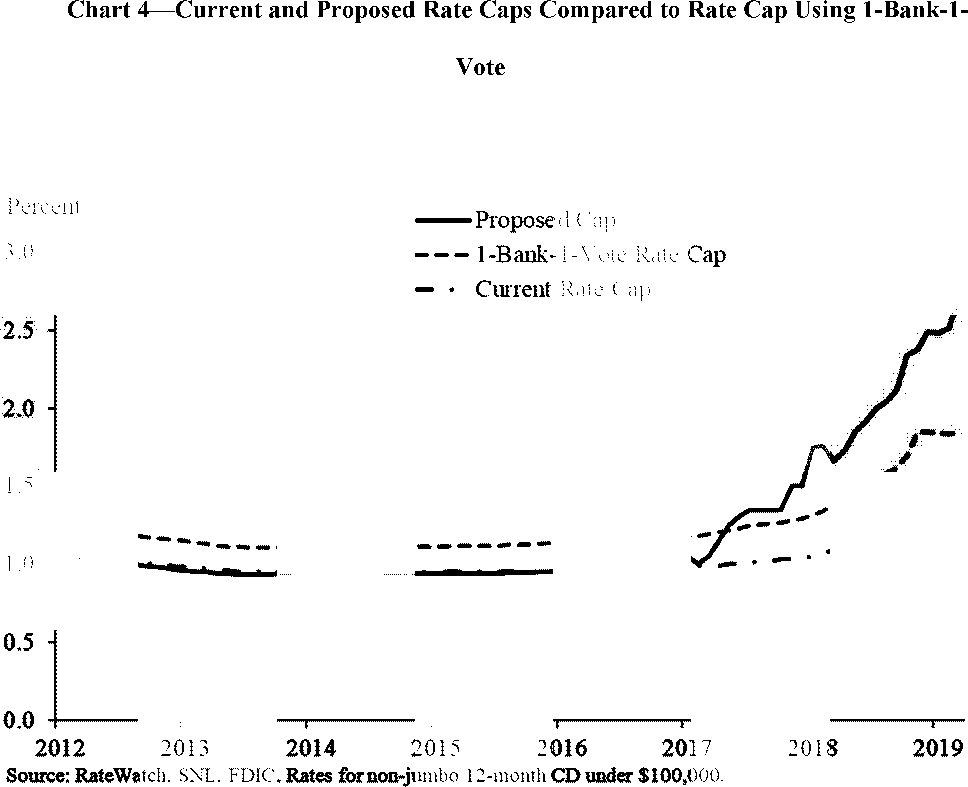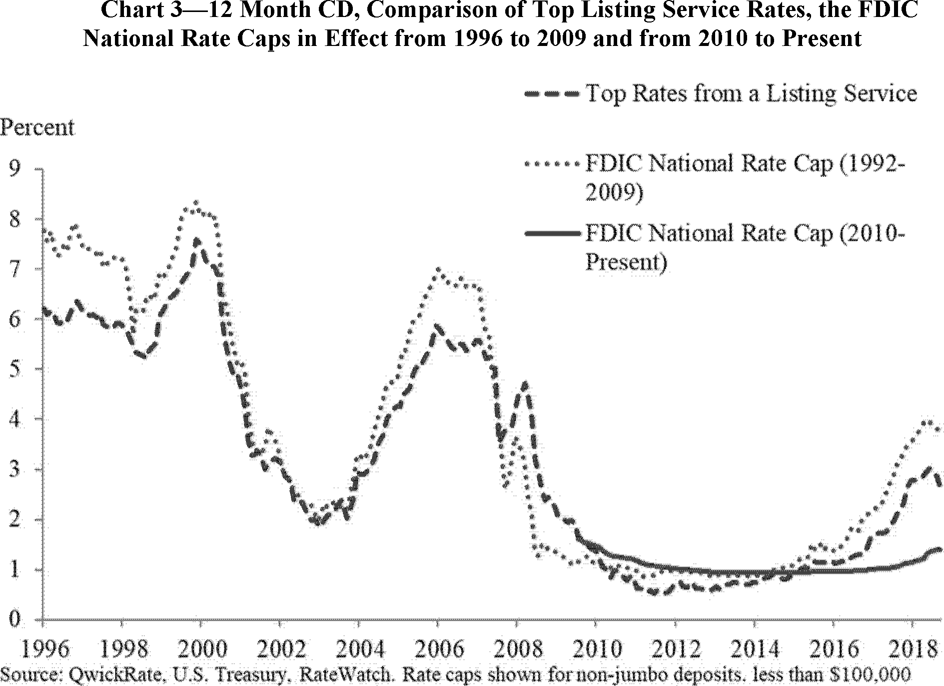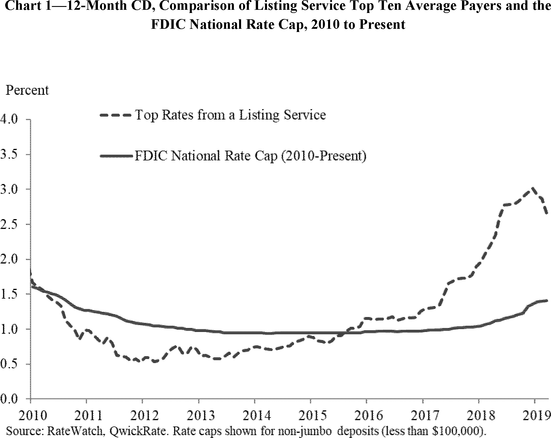 The current interest rate cap regulations became effective in 2010 and were adopted to modify the previous national rate cap (based on U.S. Treasury securities) that had become overly restrictive. Chart 1 below reflects the current national rate cap and the average of the top ten rates paid for a 12-month CD between 2010 and the present.[25]