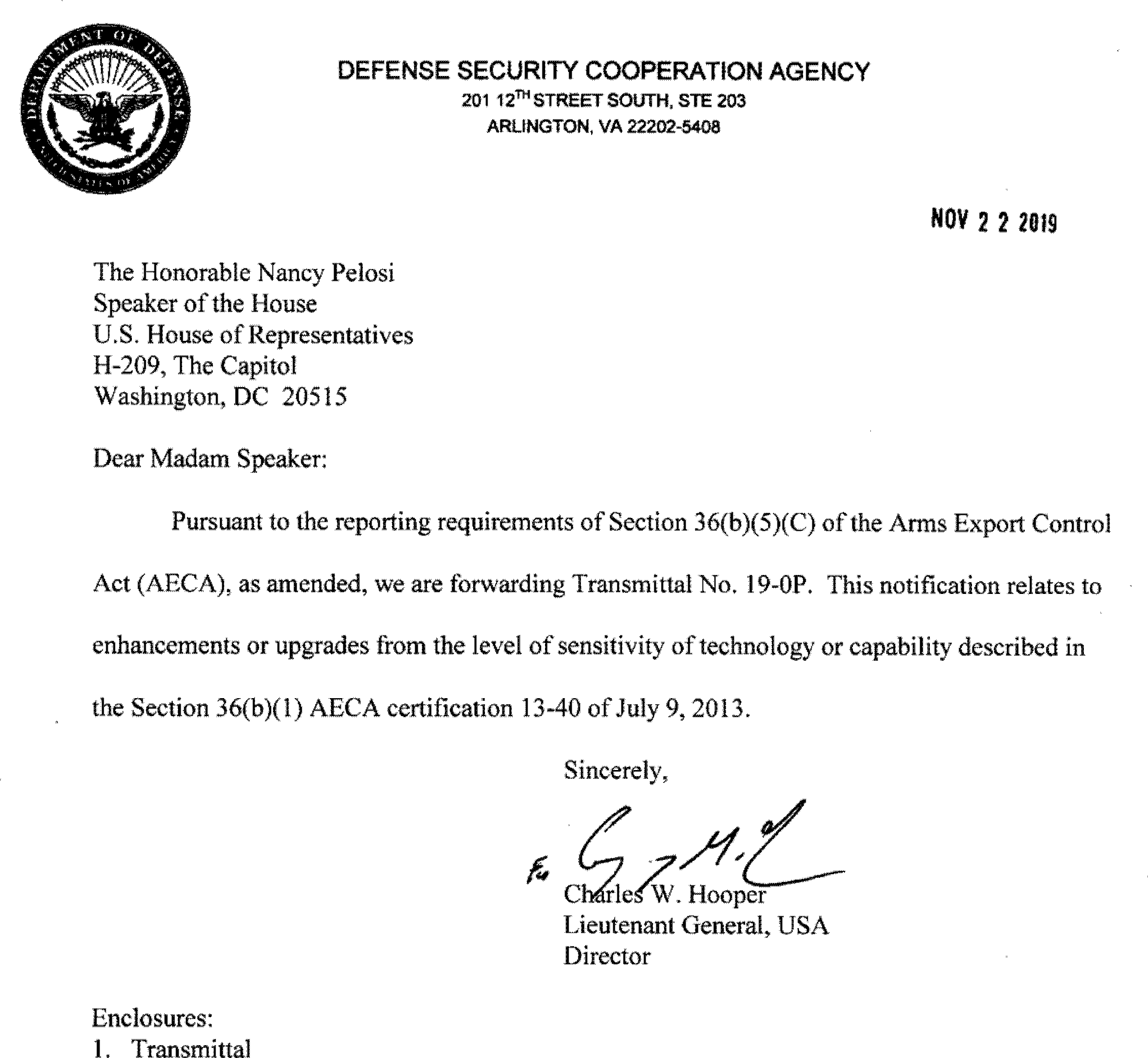 This 36(b)(5)(C) arms sales notification is published to fulfill the requirements of section 155 of Public Law 104-164 dated July 21, 1996. The following is a copy of a letter to the Speaker of the House of Representatives, Transmittal 19-0P with attached Policy Justification and Sensitivity of Technology.