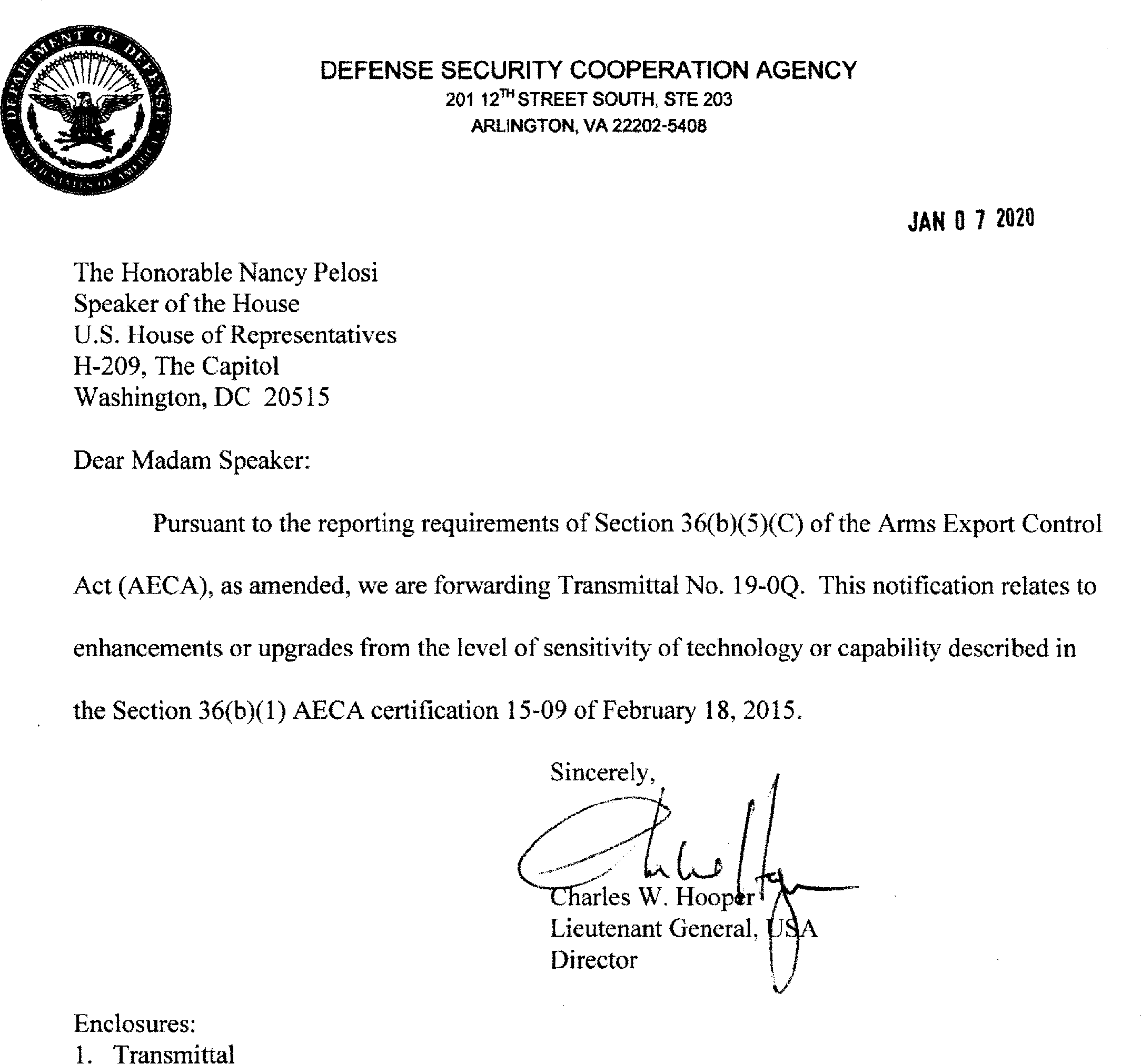 This 36(b)(5)(C) arms sales notification is published to fulfill the requirements of section 155 of Public Law 104-164 dated July 21, 1996. The following is a copy of a letter to the Speaker of the House of Representatives, and Transmittal 19-0Q.