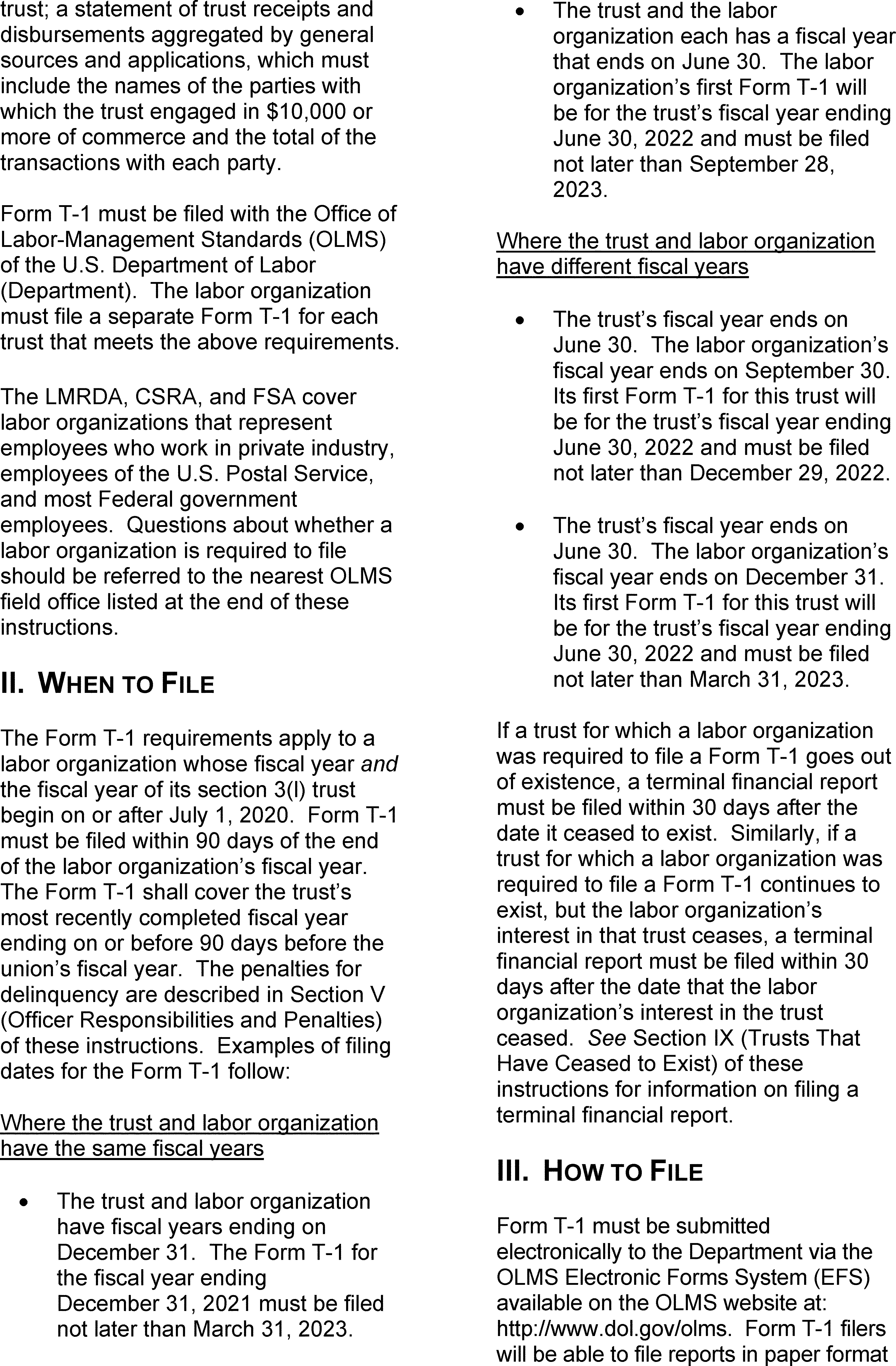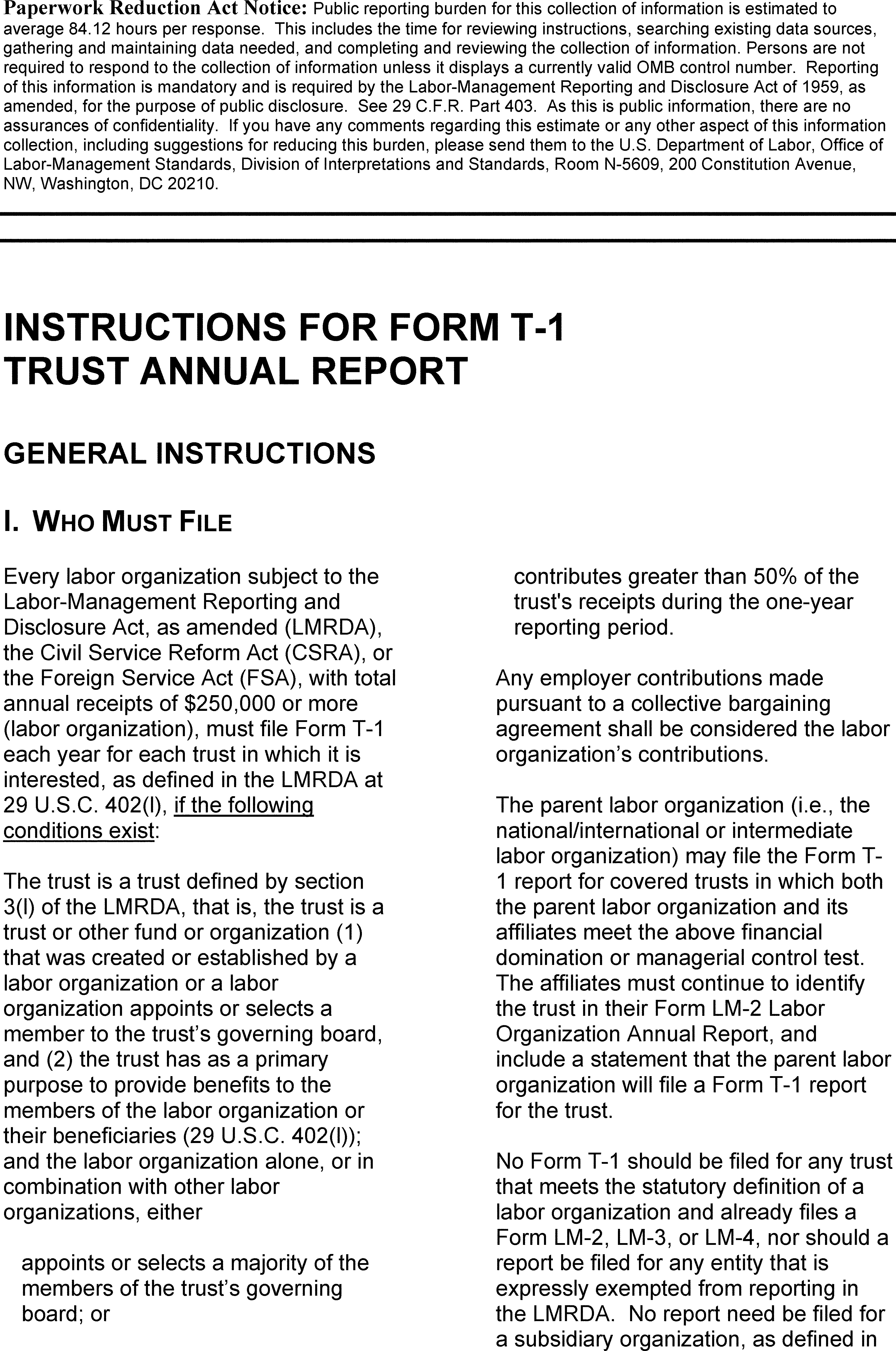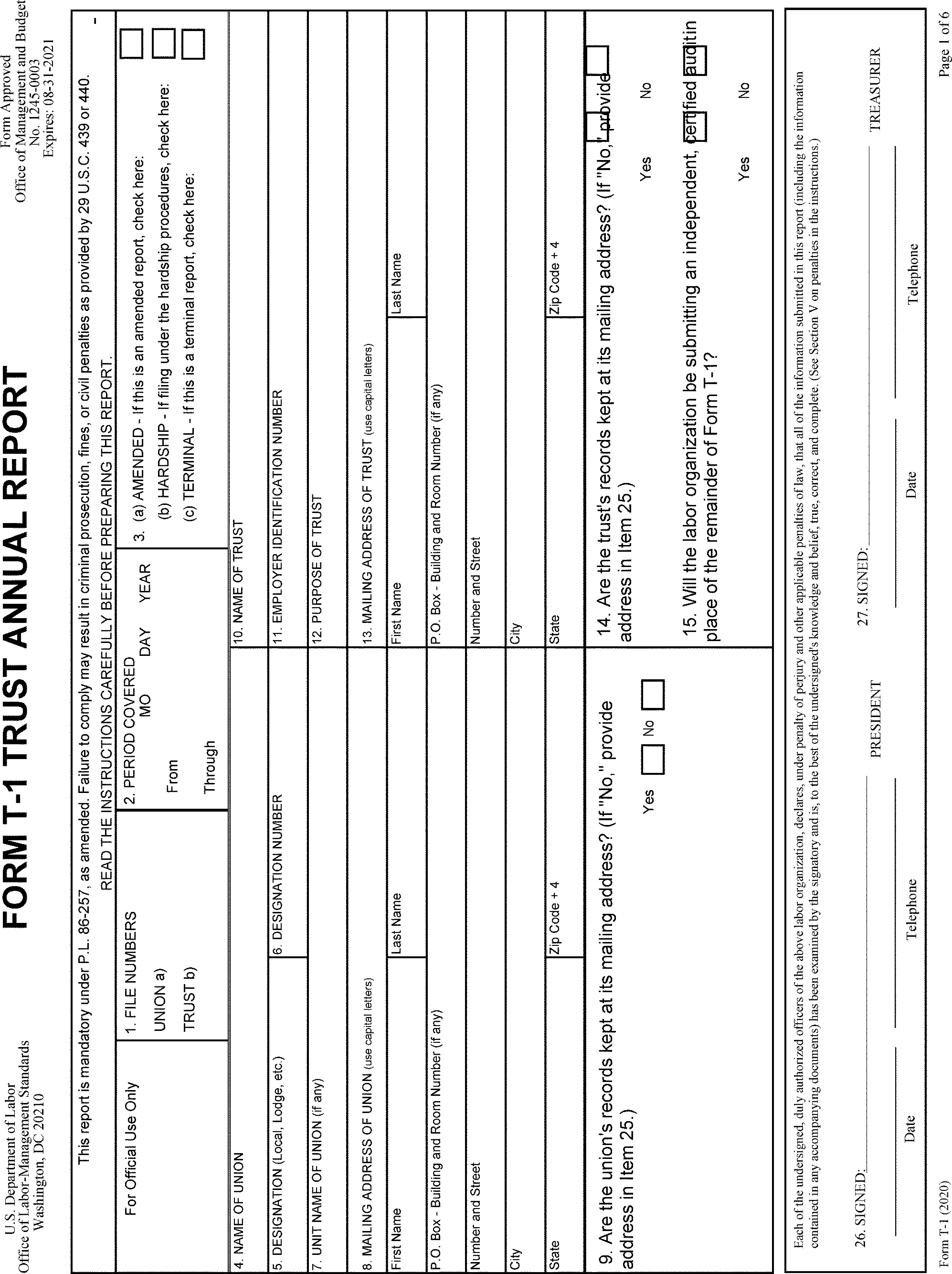 “Labor Organization Annual Financial Reports For Trusts In Which A Labor Organization Is Interested, Form T-1,” thefederalregister.org (March 6, 2020), https://thefederalregister.org/documents/2020-03958/labor-organization-annual-financial-reports-for-trusts-in-which-a-labor-organization-is-interested-form-t-1.