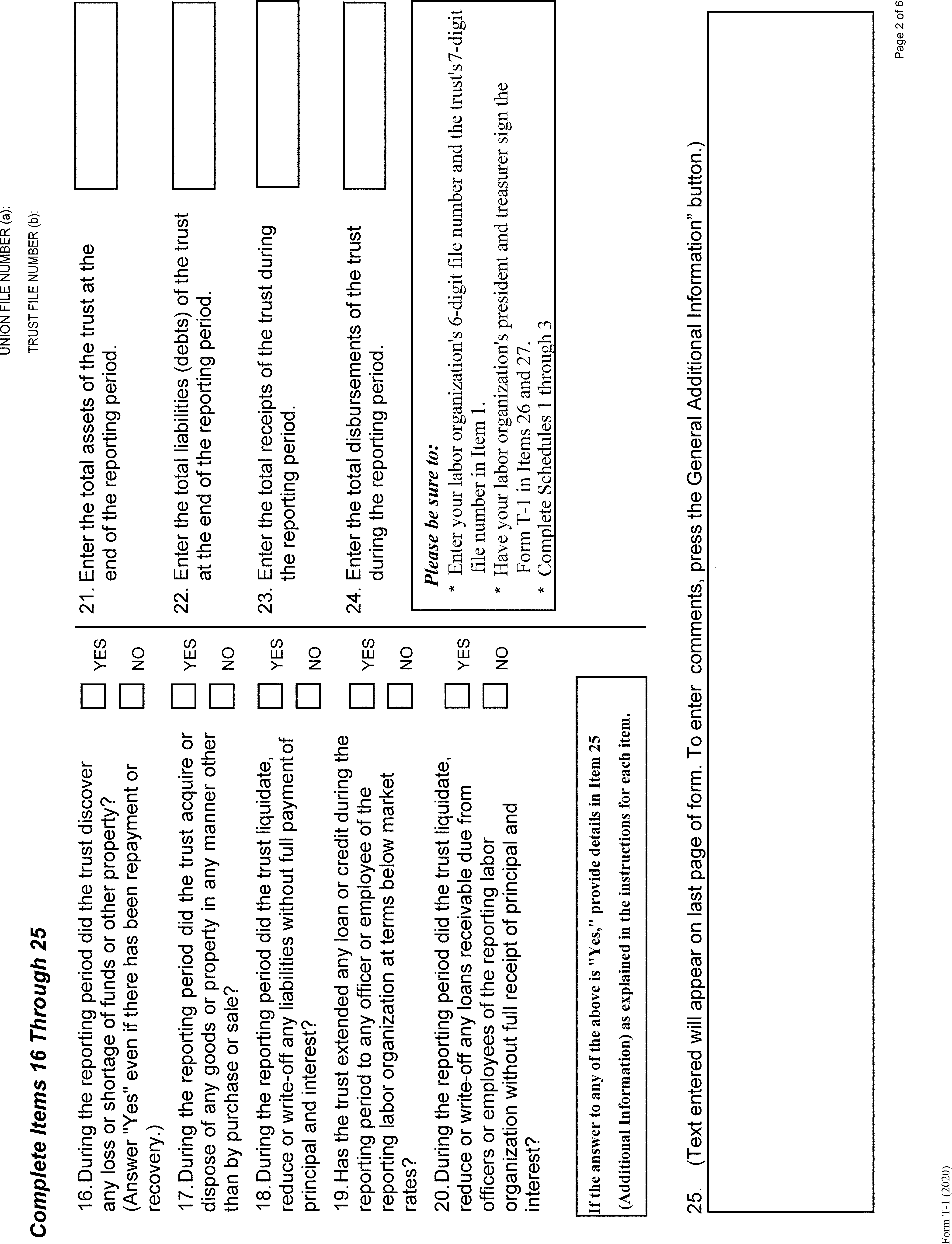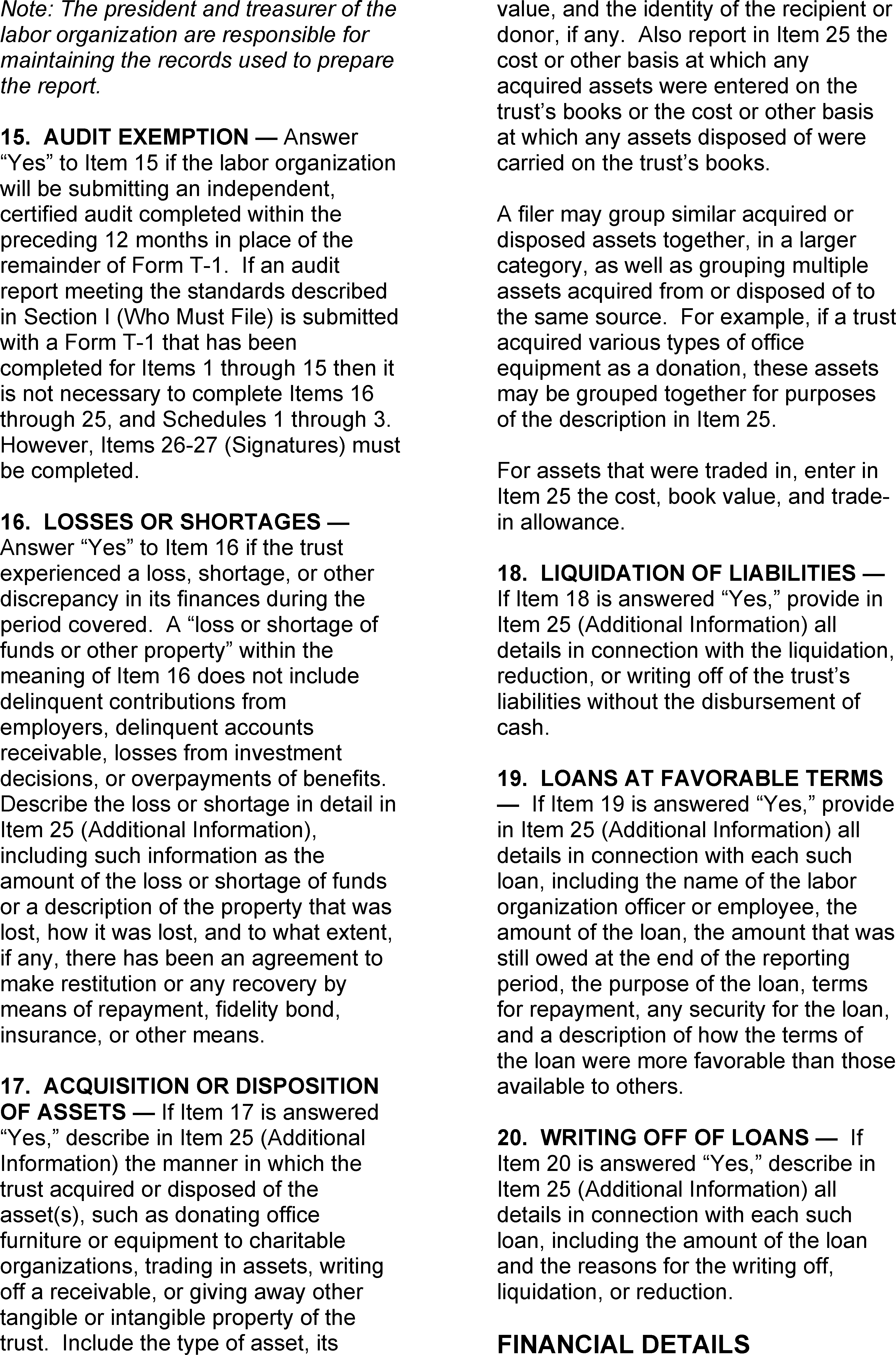 (4) A labor organization may complete only Items 1 through 15 and Items 26 through 27 (Signatures) of Form T-1 if an annual audit prepared according to standards set forth in the Form T-1 instructions was performed and a copy of that audit is filed with the Form T-1.