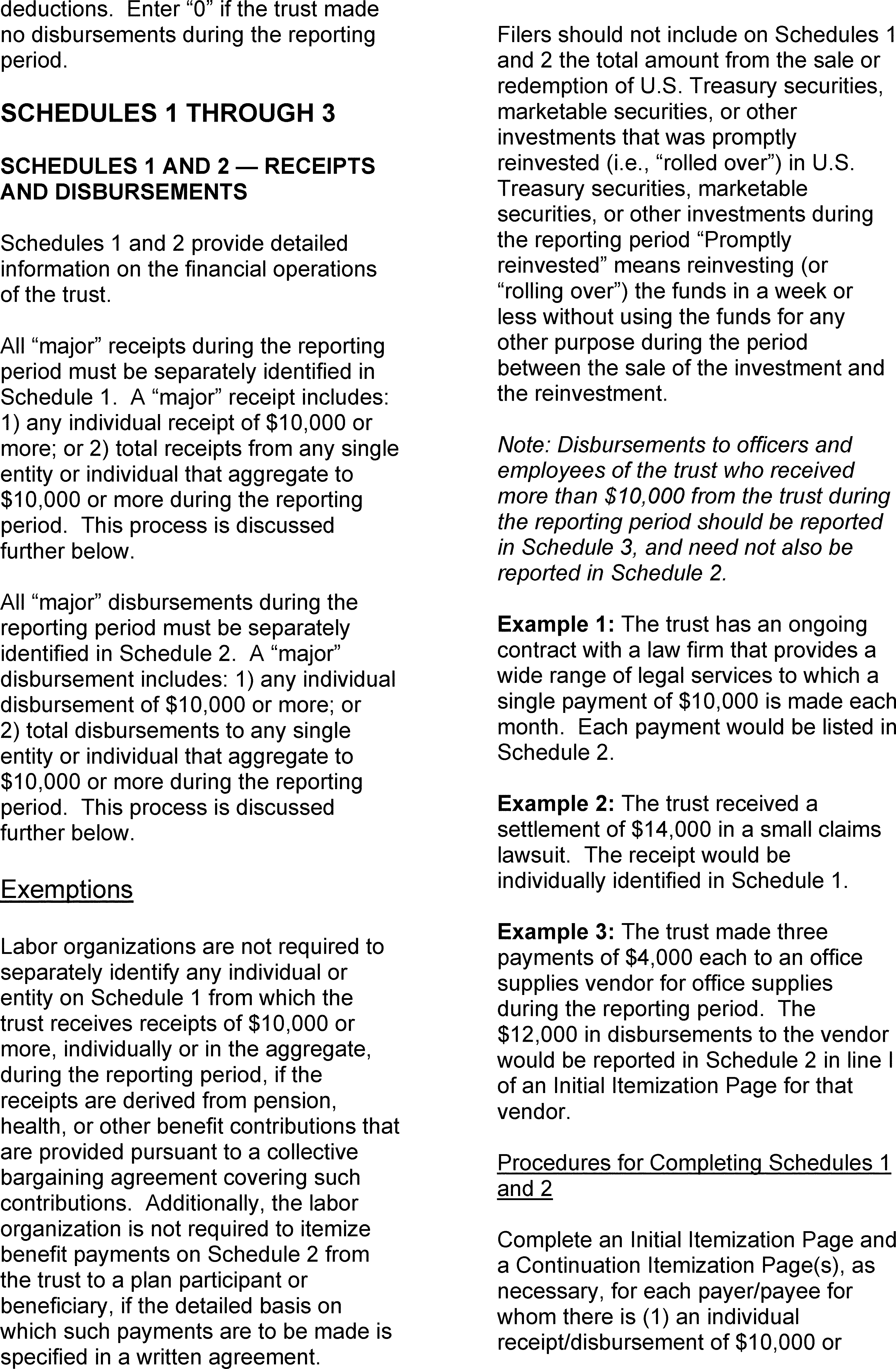 In this rule, the Department revises the forms required by labor organizations under the Labor-Management Reporting and Disclosure Act (“LMRDA” or “Act”). Under the rule, specified labor organizations file annual reports (Form T-1) concerning trusts in which they are interested. This document also sets forth the Department's review of and response to comments on the proposed rule. Under this rule, the Department requires a labor organization with total annual receipts of $250,000 or more (and, which therefore is obligated to file a Form LM-2 Labor Organization Annual Report) to also file a Form T-1, under certain circumstances, for each trust of the type defined by section 3(l) of the LMRDA (defining “trust in which a labor organization is interested”). Such labor organizations will trigger the Form T-1 reporting requirements, subject to certain exemptions, where the labor organization during the reporting period, either alone or in combination with other labor organizations, selects or appoints the majority of the members of the trust's governing board or contributes more than 50 percent of the trust's receipts. When applying this financial or managerial dominance test, contributions made pursuant to a collective bargaining agreement (CBA) shall be considered the labor organization's contributions. The rule provides appropriate instructions and revises relevant sections relating to such reports. The Department issues the rule pursuant to section 208 of the LMRDA.