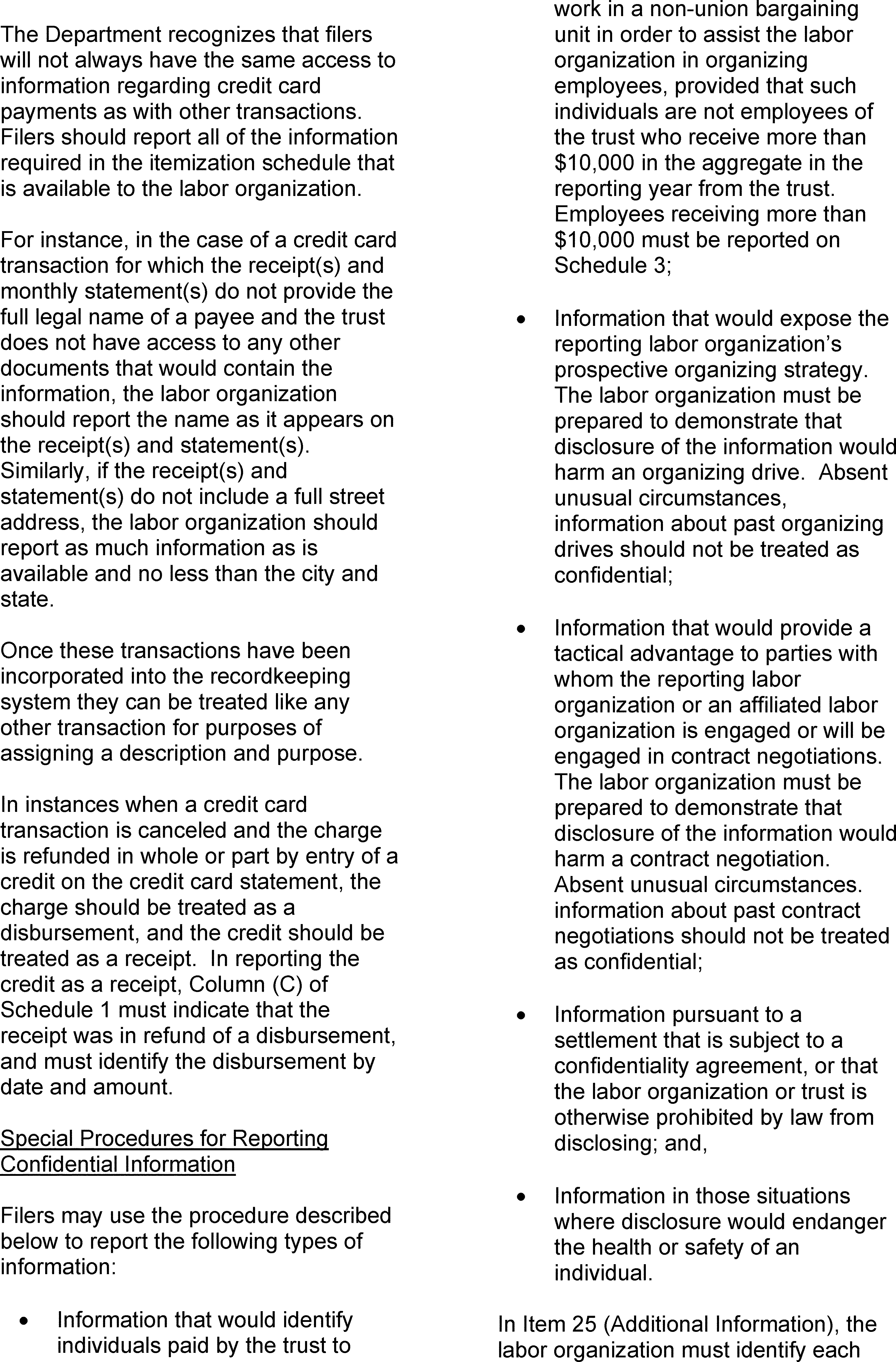 about a labor organization's assets, liabilities, receipts, disbursements, loans to officers and employees and business enterprises, payments to each officer, and payments to each employee of the labor organization paid more than $10,000 during the fiscal year. The reporting detail required of labor organizations, as the Secretary has established by rule, varies depending on the amount of the labor organization's annual receipts. 29 CFR 403.4.