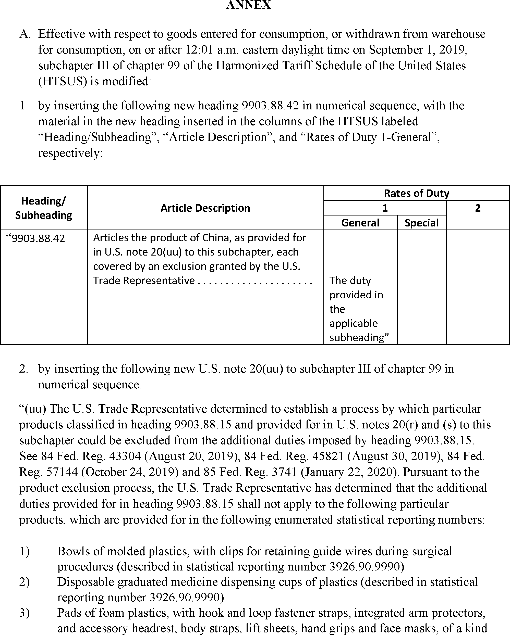 additional duty applicable to the tariff subheadings covered by the action announced in the August 20 notice from 10 percent to 15 percent. On January 22, 2020, the U.S. Trade Representative determined to reduce the rate from 15 percent to 7.5 percent. The U.S. Trade Representative initiated a product exclusion process in October 2019, and interested persons have submitted requests for the exclusion of specific products. This notice announces the U.S. Trade Representative's determination to grant certain exclusion requests, as specified in the Annex to this notice. The U.S. Trade Representative will continue to issue decisions on pending requests on a periodic basis.