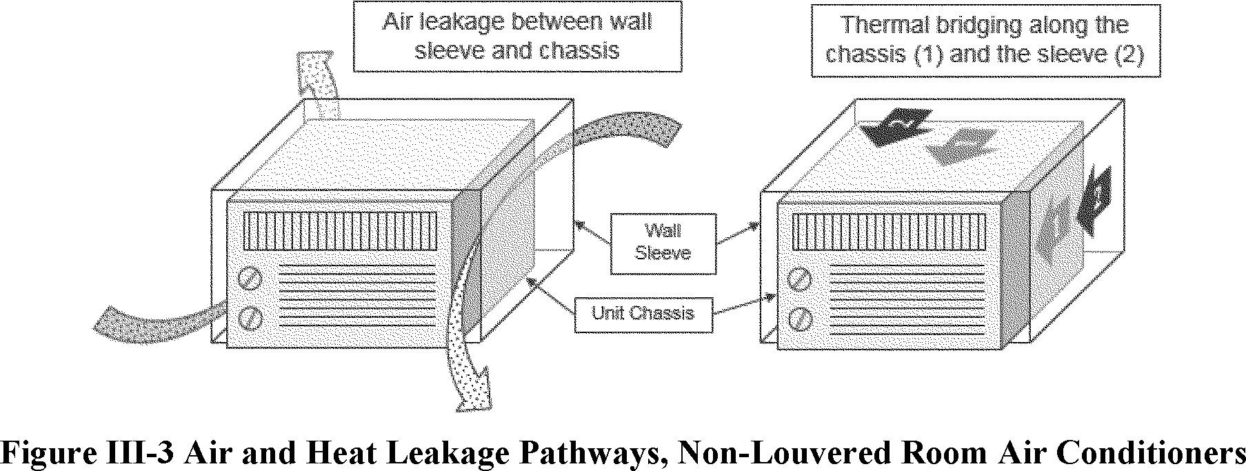Thermal bridging refers to the conductive heat transfer that can occur through the room AC chassis and wall sleeve, which are usually made of metal. The metal acts as an “easy” path for heat transfer between the indoor side and the outdoor side of the building, reducing the effective insulation of the building and leading to heat gain, which is undesirable when a consumer seeks to cool an indoor space.