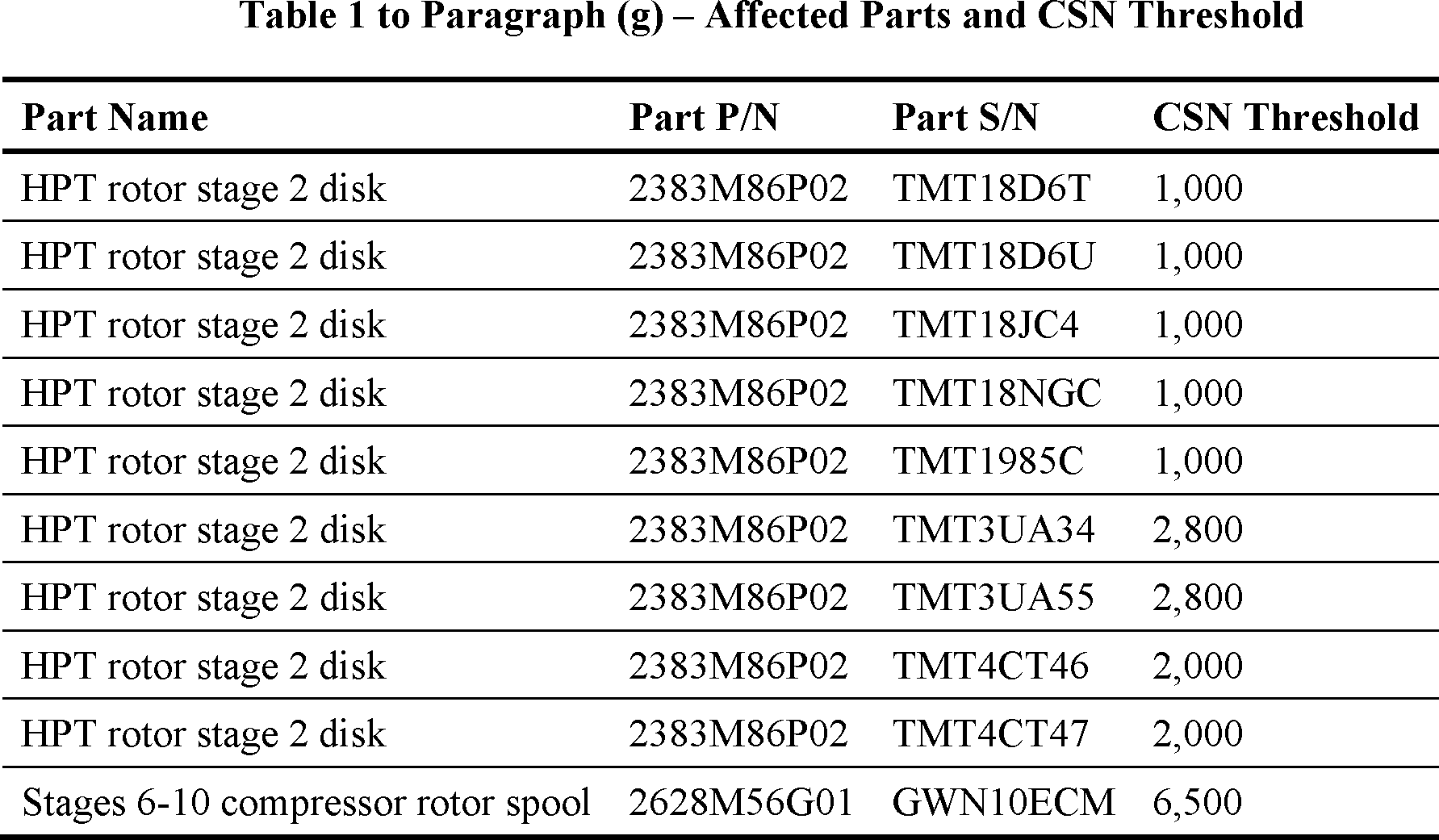 After the effective date of this AD, before the parts accumulate the cycles since new (CSN) threshold listed in Table 1 to paragraph (g) of this AD, remove the affected HPT rotor stage 2 disk and the stages 6-10 compressor rotor spool from service and replace with parts eligible for installation.