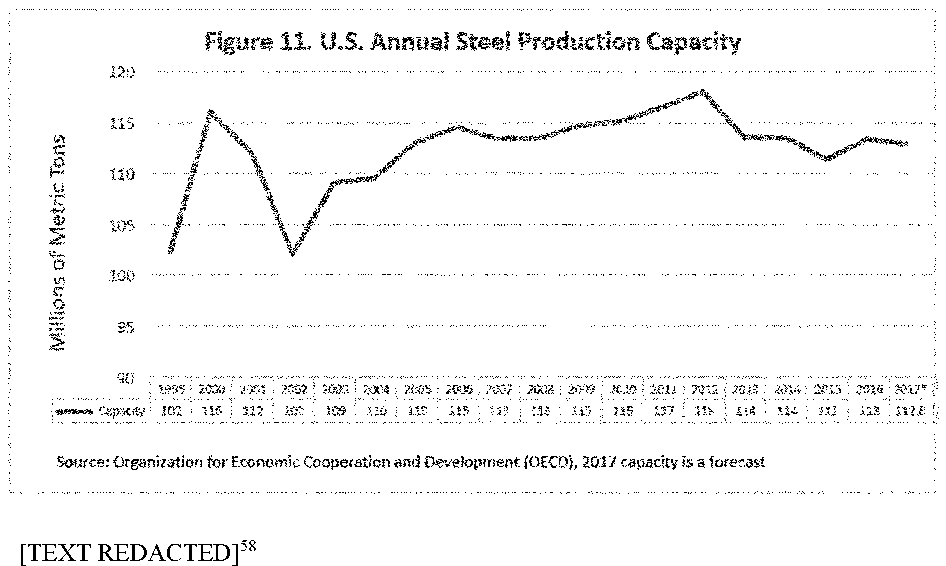 In 2016, U.S. steel production was 78.6 million metric tons and U.S. capacity was 113.3 million metric tons, which represents a 69.4 percent capacity utilization rate. If current import trends for 2017 continue, continued imports without any action are projected to be 36.0 million metric tons, an increase over 2016 of 6.0 million metric tons. Even with U.S. demand projected to increase to 107.3 from 99.8 million metric tons, increased imports mean U.S. capacity utilization is forecast to rise only to 72.3 percent, a non-financially viable and unsustainable level of operation.