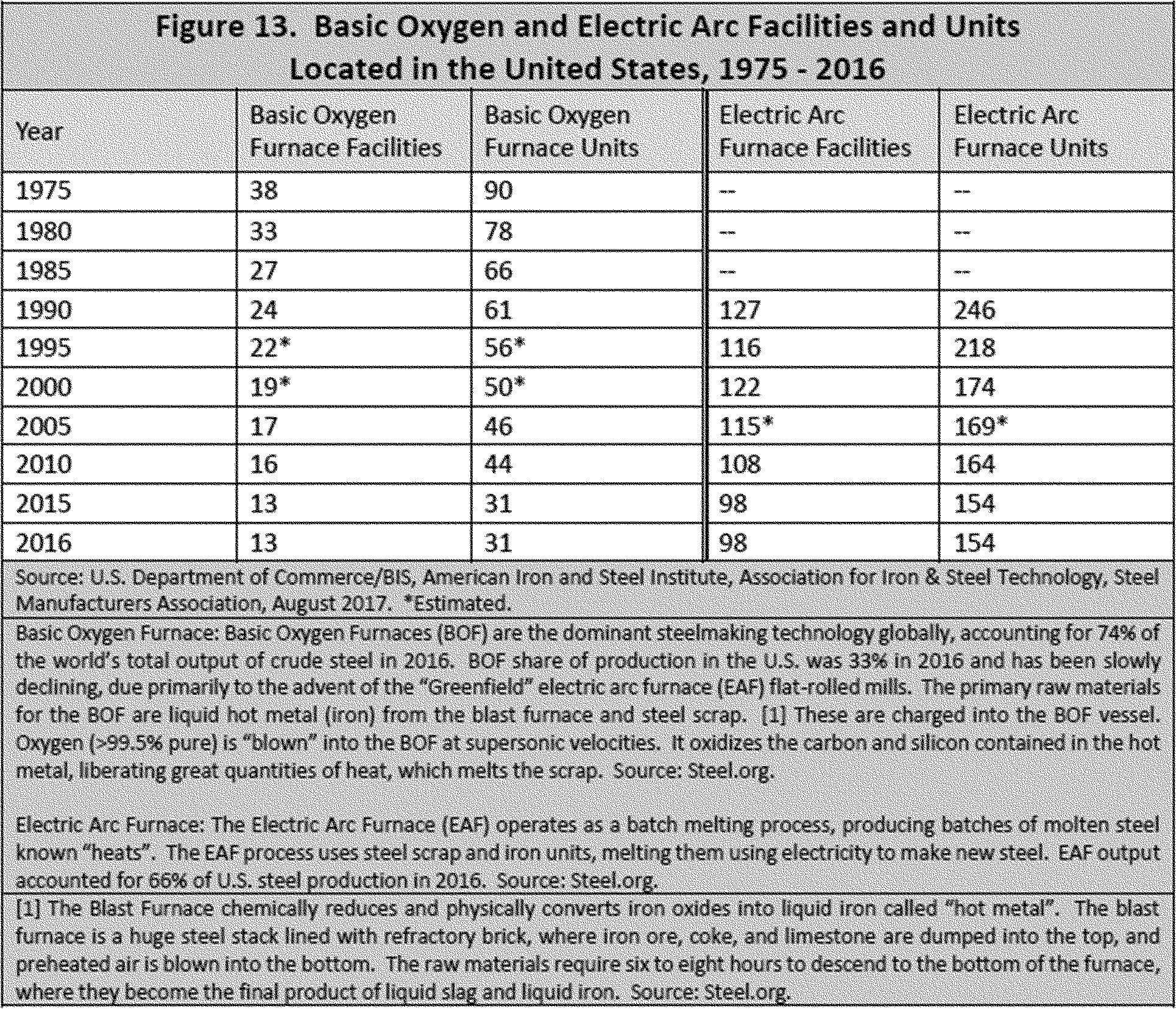4. Domestic steel production depends on a healthy and competitive U.S. industry. The principal types of mills that produce steel are integrated mills with basic oxygen furnaces (BOFs); mini-mills using electric arc furnaces (EAFs); re-roller/converter; and metal coater facilities. Basic oxygen furnaces convert raw materials into steel, and remain critical for continued innovation in steel technology. Covered in this report are five categories of steel products that are used for national security applications: flat, long, semi-finished, pipe and tube, and stainless.