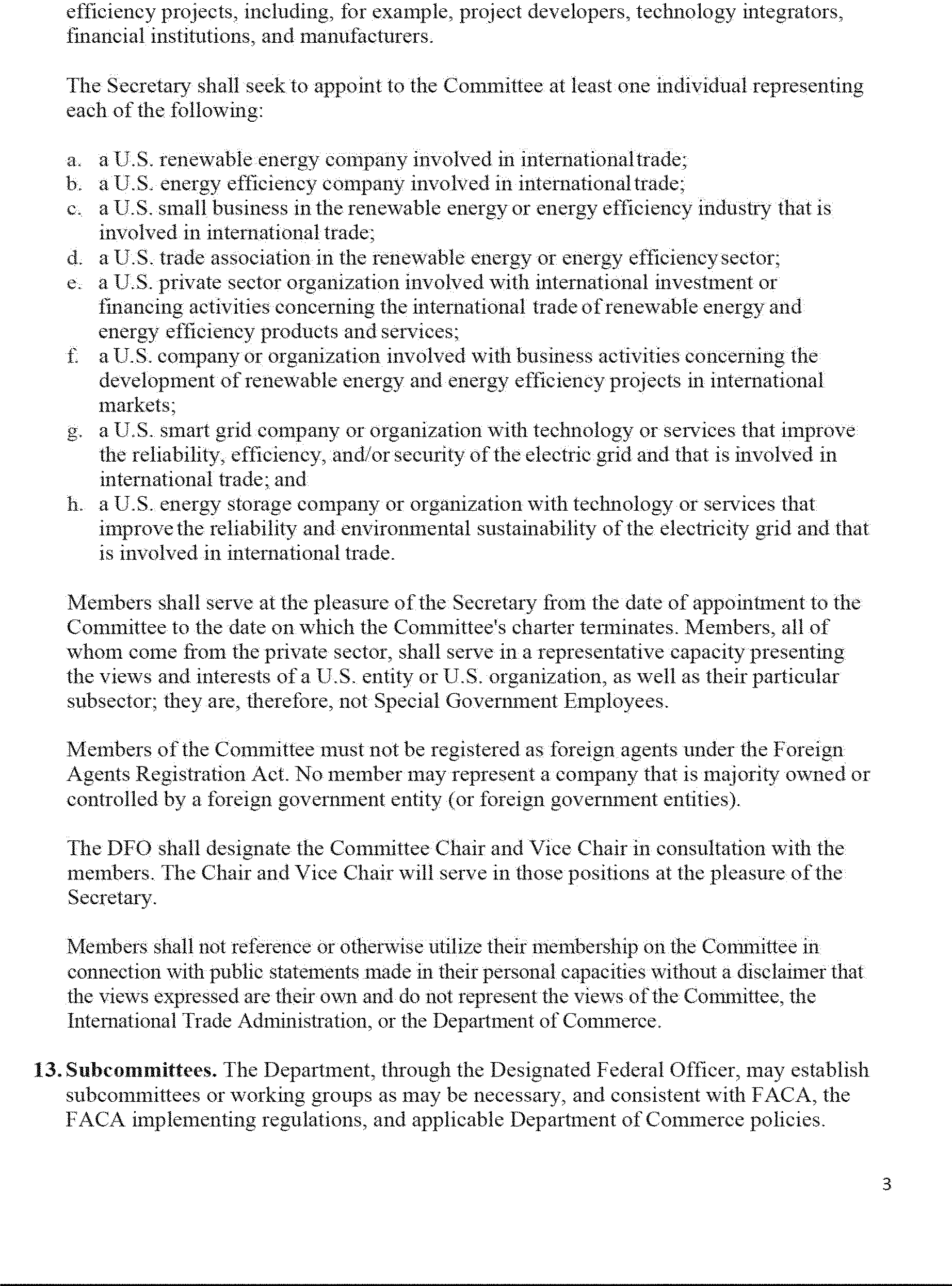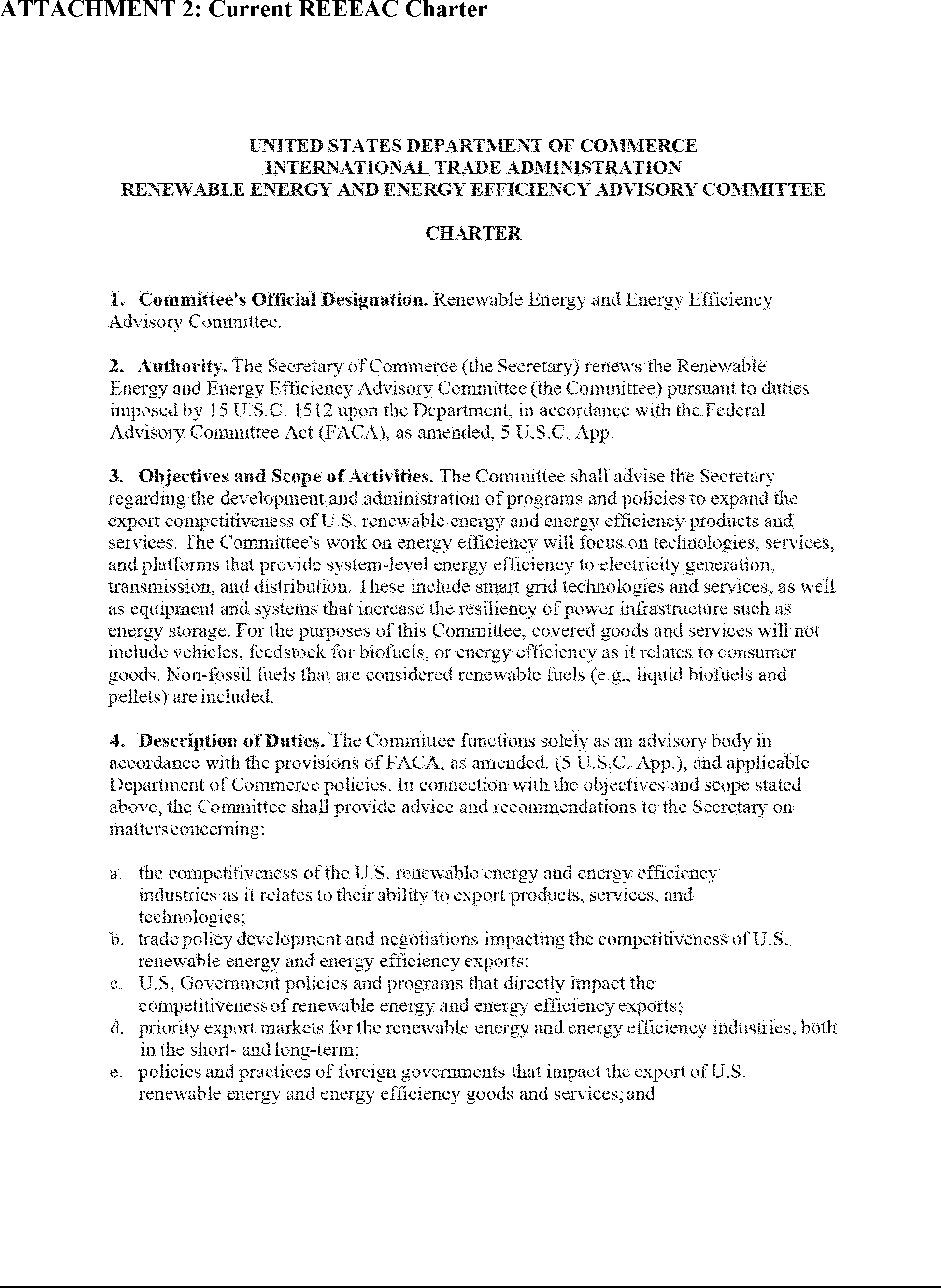 Pursuant to provisions of the Federal Advisory Committee Act, 5 U.S.C. App., the Department of Commerce announces the renewal of the Renewable Energy and Energy Efficiency Advisory Committee (the Committee). The Committee shall advise the Secretary of Commerce regarding the development and administration of programs and policies to expand the competitiveness of U.S. exports of renewable energy and energy efficiency goods and services. The Committee's work on energy efficiency will focus on technologies, services, and platforms that provide system-level energy efficiency to electricity generation, transmission, and distribution. These include smart grid technologies and services, as well as equipment and systems that increase the resiliency of power infrastructure such as energy storage. For the purposes of this Committee, covered goods and services will not include vehicles, feedstock for biofuels, or energy efficiency as it relates to consumer goods. Non-fossil fuels that are considered renewable fuels ( e.g., liquid biofuels and pellets) are included. This notice also requests nominations for membership.