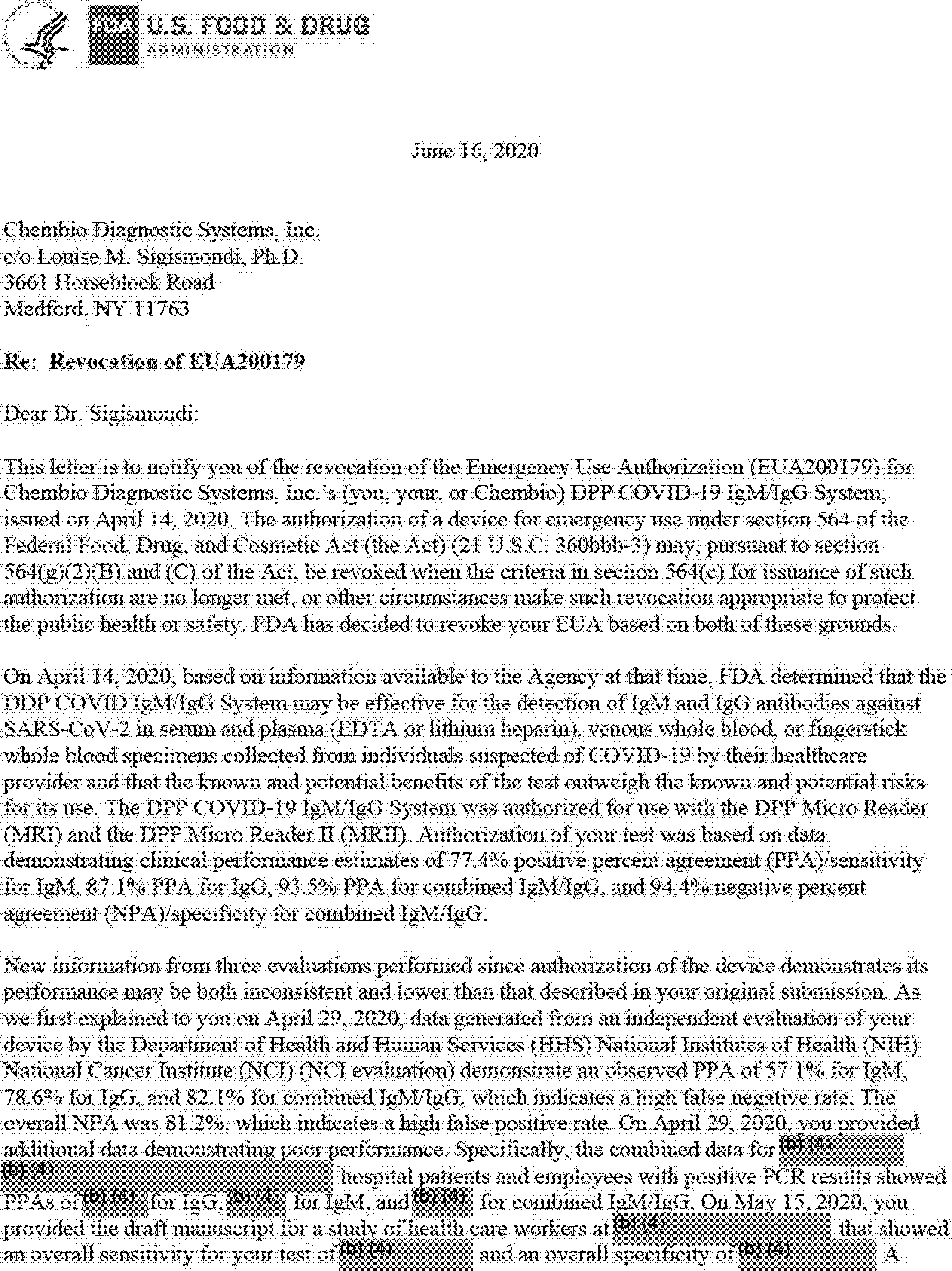 Under section 564(g)(2)(B) and (C) of the FD&C Act, the Secretary of HHS may revoke an EUA if, among other things, the criteria for issuance are no longer met or other circumstances make such revocation appropriate to protect the public health or safety. On June 16, 2020, FDA revoked the EUA for Chembio's DPP COVID-19 IgM/IgG System because the criteria for issuance were no longer met and other circumstances make such revocation appropriate to protect the public health or safety. Under section 564(c)(2) of the FD&C Act an EUA may be issued only if FDA concludes that, based on the totality of scientific evidence available to the Secretary, including data from adequate and well-controlled clinical trials, if available, it is reasonable to believe that the product may be effective in diagnosing, treating, or preventing such disease or condition and the known and potential benefits of the product, when used to diagnose, prevent, or treat such disease or condition, outweigh the known and potential risks of the product. Given the poor device performance observed in multiple evaluations since the Authorization, FDA has concluded it is not reasonable to believe the product may be effective in detecting antibodies against SARS-CoV-2 or that the known and potential benefits of the device outweigh its known and potential risks. In addition, based on the same information and the risks to public health from false test results, FDA has concluded under section 564(g)(2)(C) of the FD&C Act that other circumstances make revocation appropriate to protect the public health or safety. Accordingly, FDA has revoked EUA200179 for the DPP COVID-19 IgM/IgG System, pursuant to section 564(g)(2)(B) and (C) of the FD&C Act.