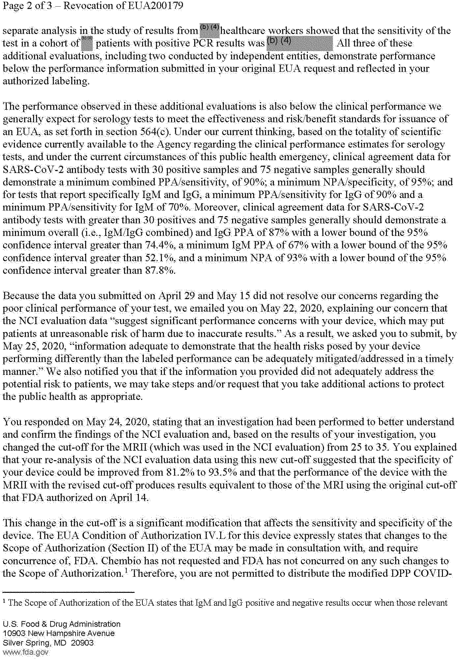 Chembio's Authorization is revoked as of June 16, 2020.