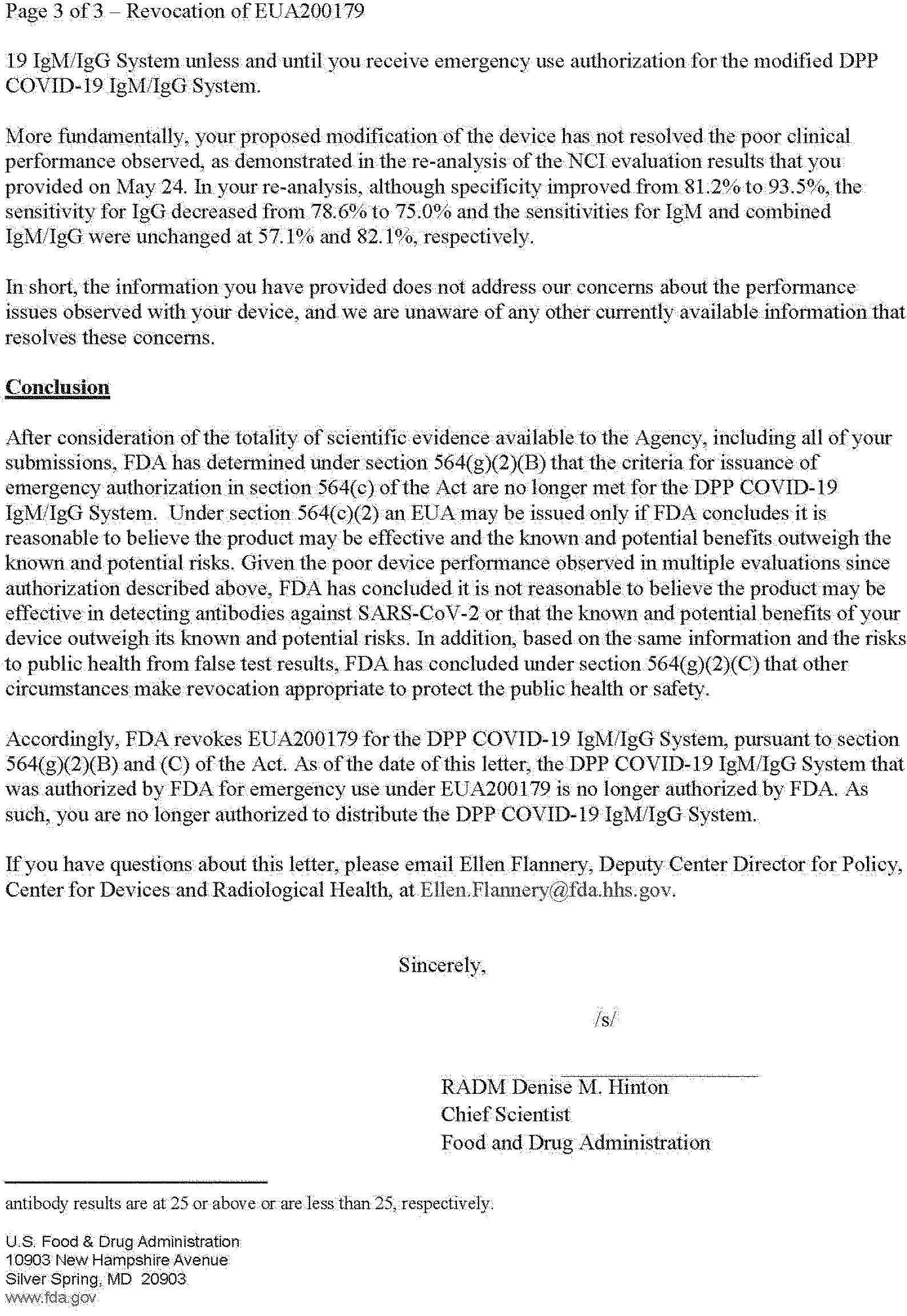 with this revocation, as required by section 564(h)(1) of the FD&C Act. Subsequent to the Authorization, FDA considered new information from three additional evaluations, including two conducted by independent entities, demonstrating performance below the performance information submitted in the original EUA request and reflected in the authorized labeling for the device.
