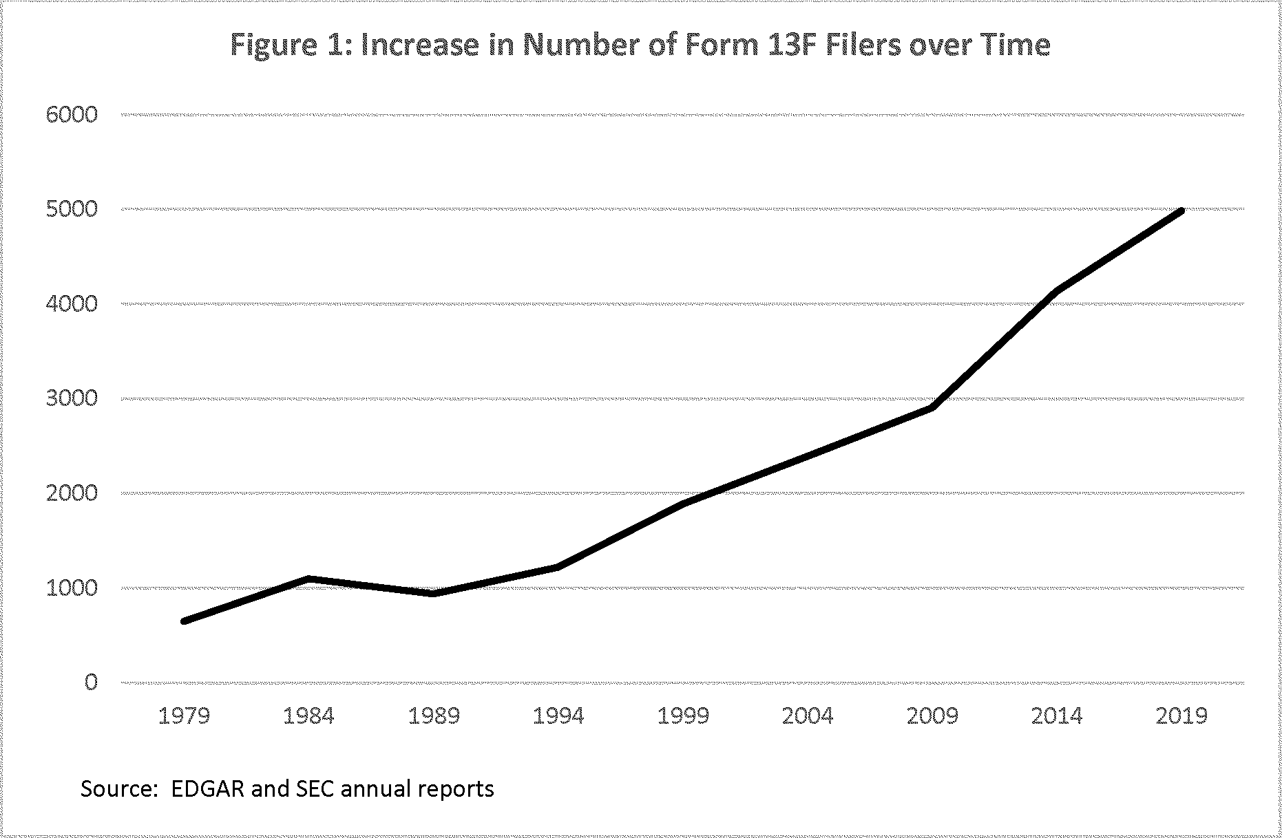 Since 1975, the relative significance of managing $100 million in securities as compared with the overall size of the U.S. equities market has declined considerably. More managers have become subject to the Form 13F reporting obligation, even though $100 million represents a much smaller fraction of the U.S. equities market, which has grown substantially in aggregate size. Figure 1 shows the rise in the number of managers that file Form 13F over time.[23]