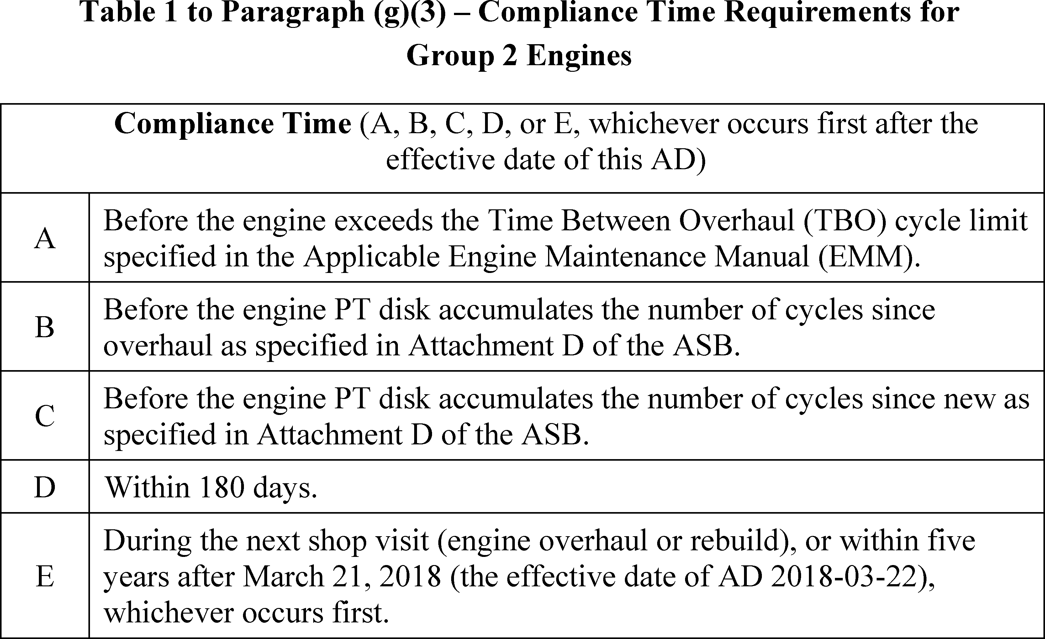 (3) For Group 2 engines: Within the compliance time identified in Table 1 to paragraph (g)(3) of this AD, modify the engine by removing the affected engine PT disk from service and replacing it with a part eligible for installation using Attachment F, Replacement Instruction, of the ASB.