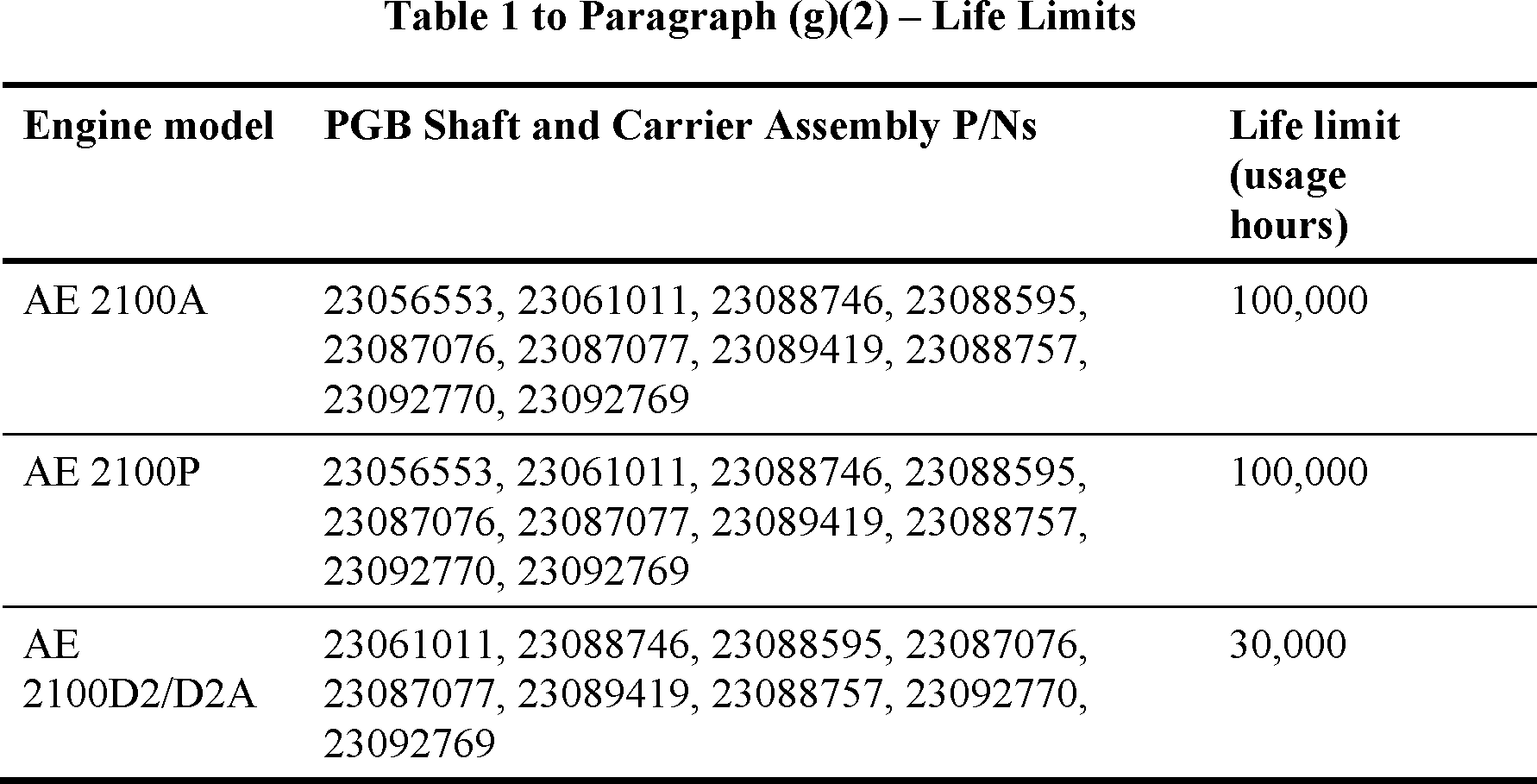 (2) After the effective date of this AD, before exceeding the life limit (usage hours) specified in Table 1 to paragraph (g)(2) (“Table 1”) of this AD, remove the PGB shaft and carrier assembly, identified by part numbers (P/Ns) in Table 1, from service and replace with a part eligible for installation.