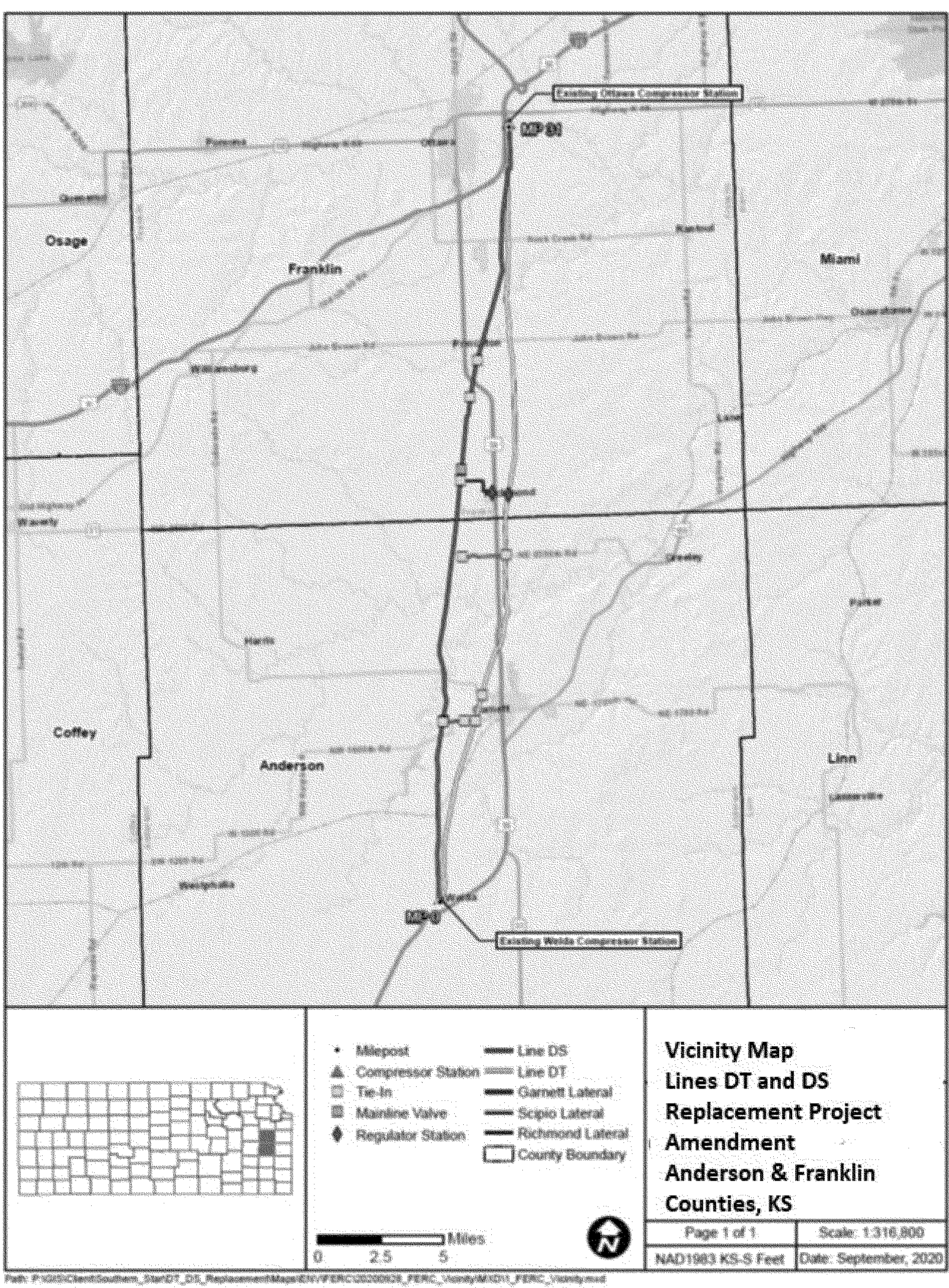Southern Star proposes to abandon Lines DT (31.8 miles) and DS (31.4 miles) in-place rather than by removal as previously proposed in Anderson and Franklin Counties, Kansas. The general location of the project facilities is shown in appendix 1.[1]