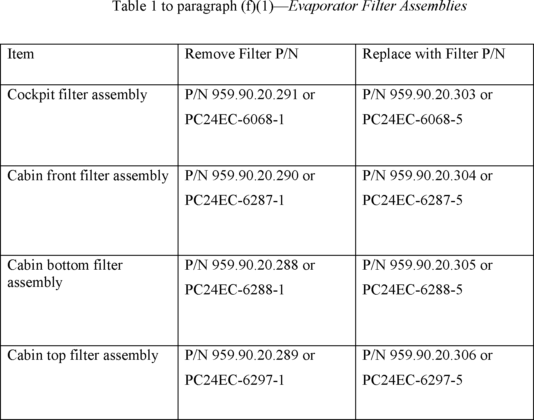 (3) Cabin bottom filter assembly P/N 959.90.20.288 (PC24EC-6288-1); or
