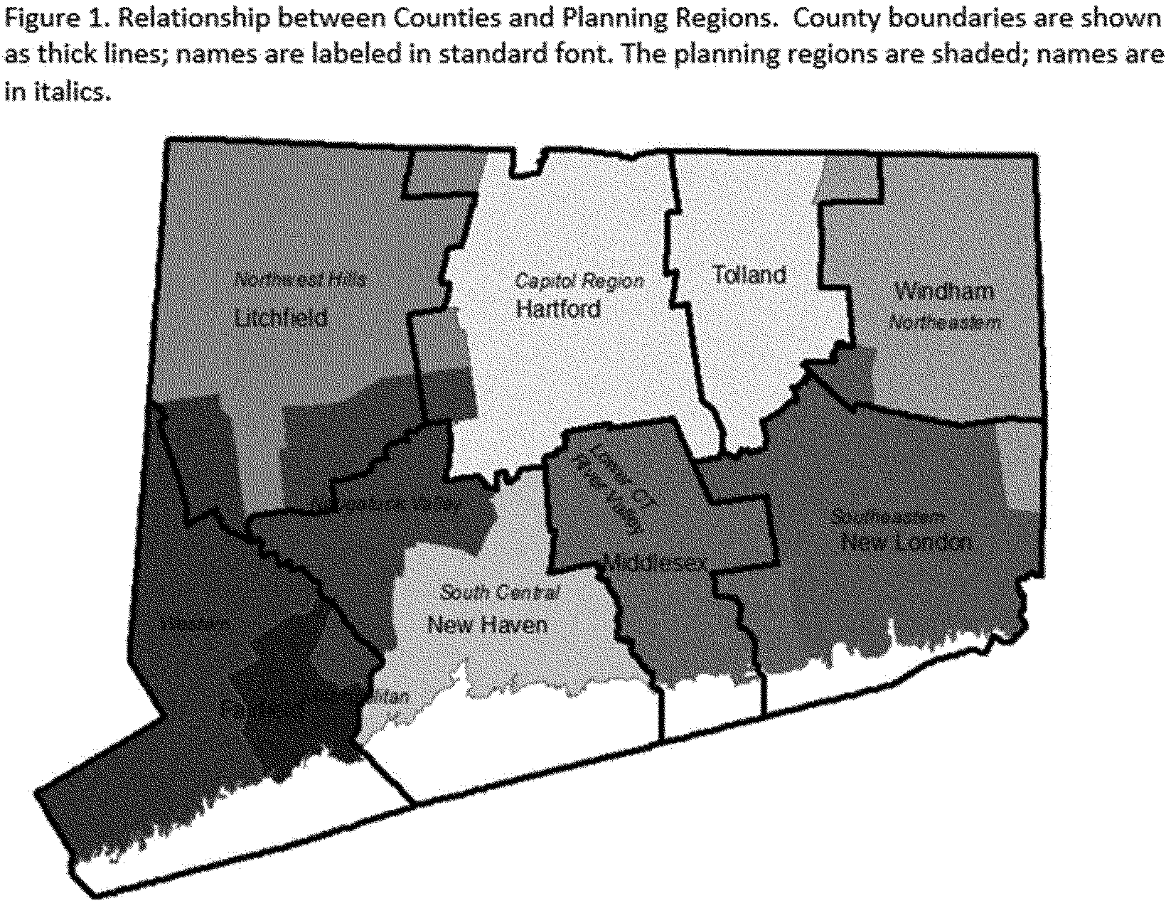 Figure 1 depicts the relationship between Connecticut's eight counties and its nine planning regions. Although the planning regions and counties do not align, there is substantial overlap, to the extent that one can discern the relationships between individual planning regions and counties. The closest relationship is between Middlesex County and Lower Connecticut River Valley planning region, with all 15 of the cities and towns within the county also located within the planning region (which also contains two towns located in New London County. See Table 2).