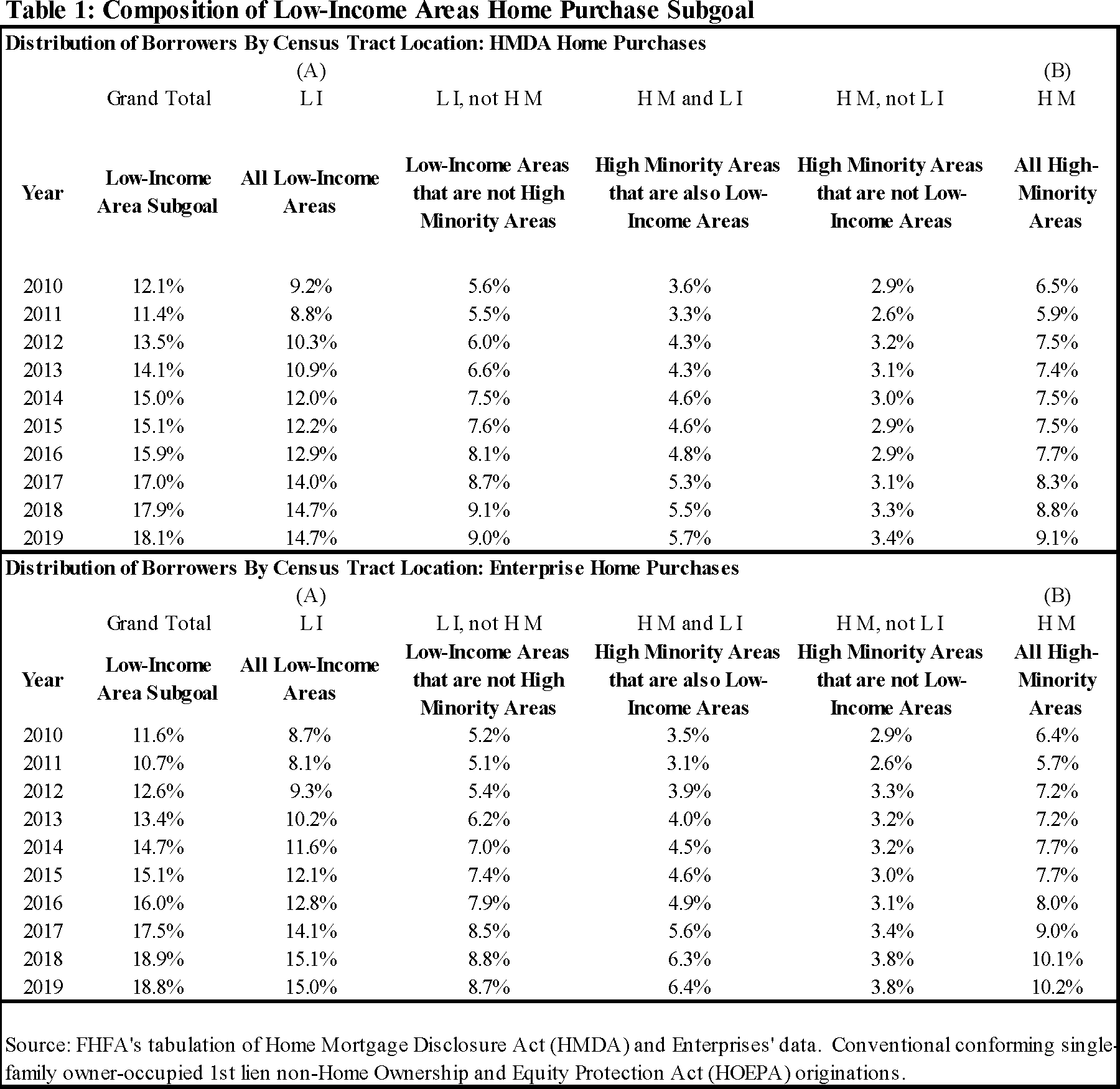 There are no borrower income requirements for criterion (1). While Enterprise mortgage acquisitions could qualify under either or both criteria, the share of the Enterprises' mortgage acquisitions satisfying criterion (1) has been consistently higher than the share of Enterprise mortgage acquisitions satisfying criterion (2) in recent years. For example, among the Enterprises' mortgage acquisitions in 2019, 15.0 percent of mortgages met only criterion (1), 10.2 percent met only criterion (2), and 6.4 percent met both criteria, as can be seen in Table 1 below. All of these shares have been increasing steadily since 2010.