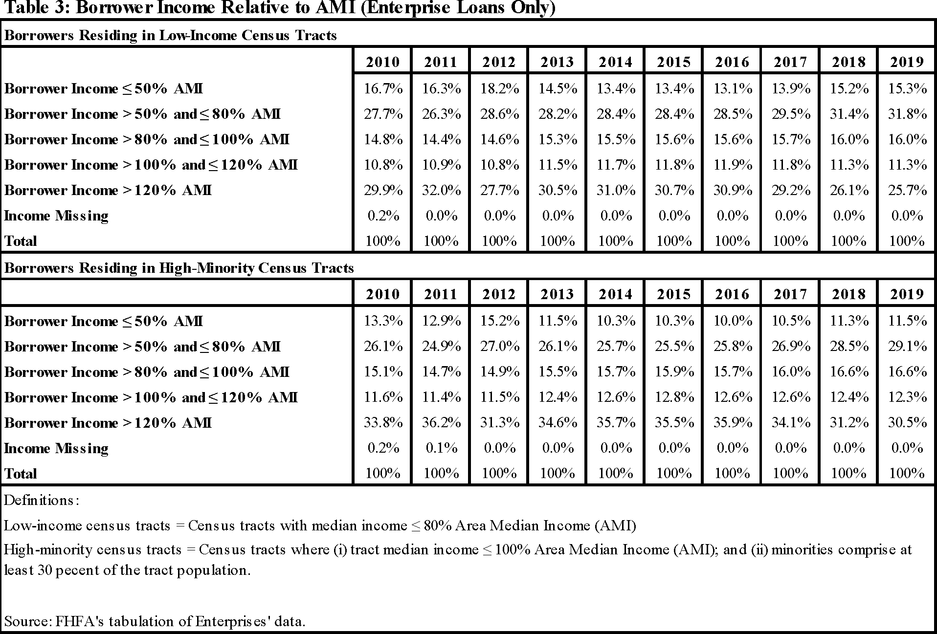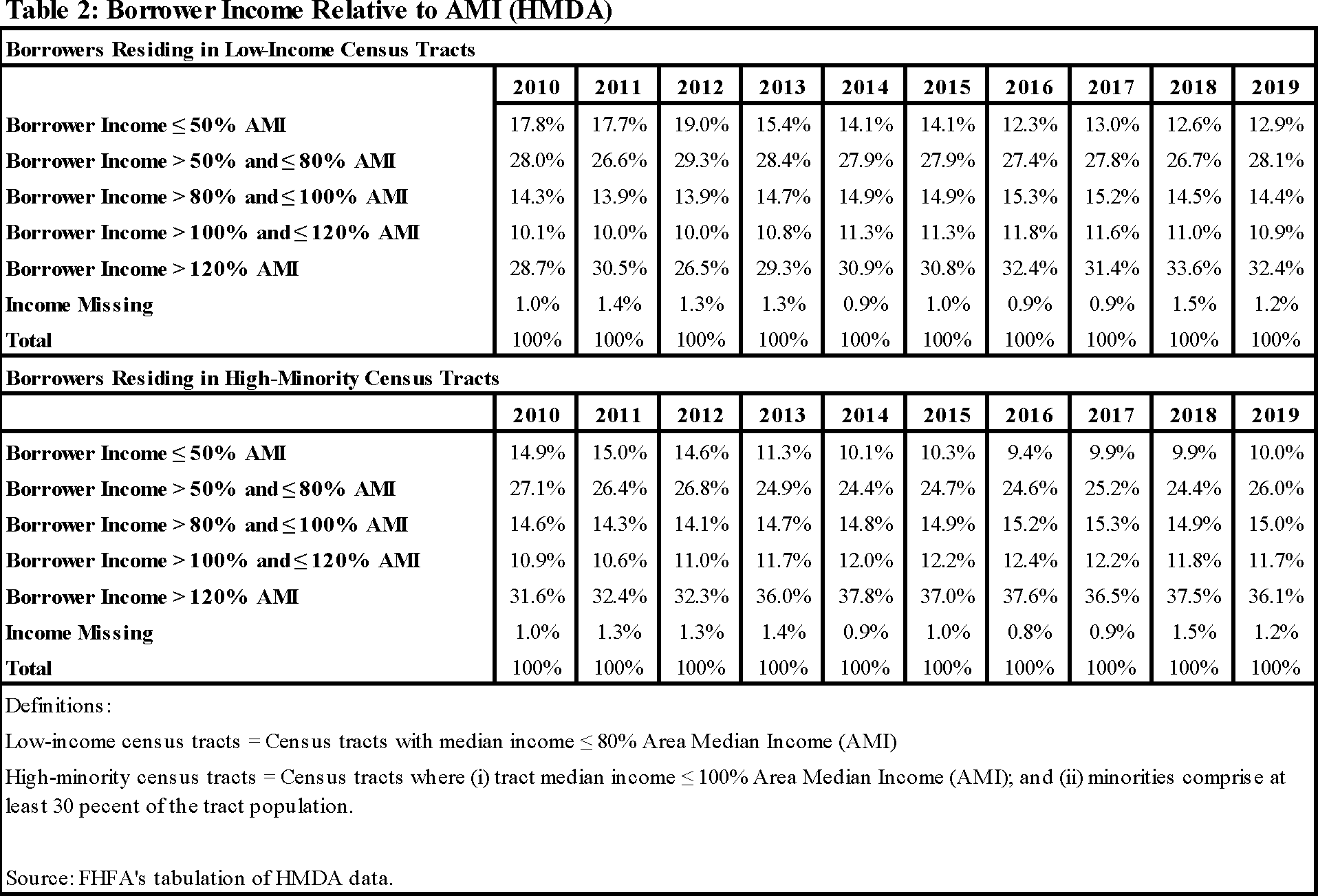 FHFA's analysis of Home Mortgage Disclosure Act (HMDA) data in Table 2 shows that both low-income areas and high-minority areas have increasing shares of borrowers with incomes at or above 100 percent of AMI, although loans to borrowers with incomes over 100 percent of AMI do not qualify for the minority areas component of the goal. For instance, the share of loans made to borrowers with incomes greater than 100 percent of AMI and residing in these low-income census tracts increased from 38.8 percent in 2010 to 44.2 percent in 2016, after dropping to 36.5 percent in 2012. This share has been relatively stable since then, with a 43.3 percent share in 2019. Nonetheless, borrowers with higher incomes have made up an increasing share of the mortgage market in low-income areas.