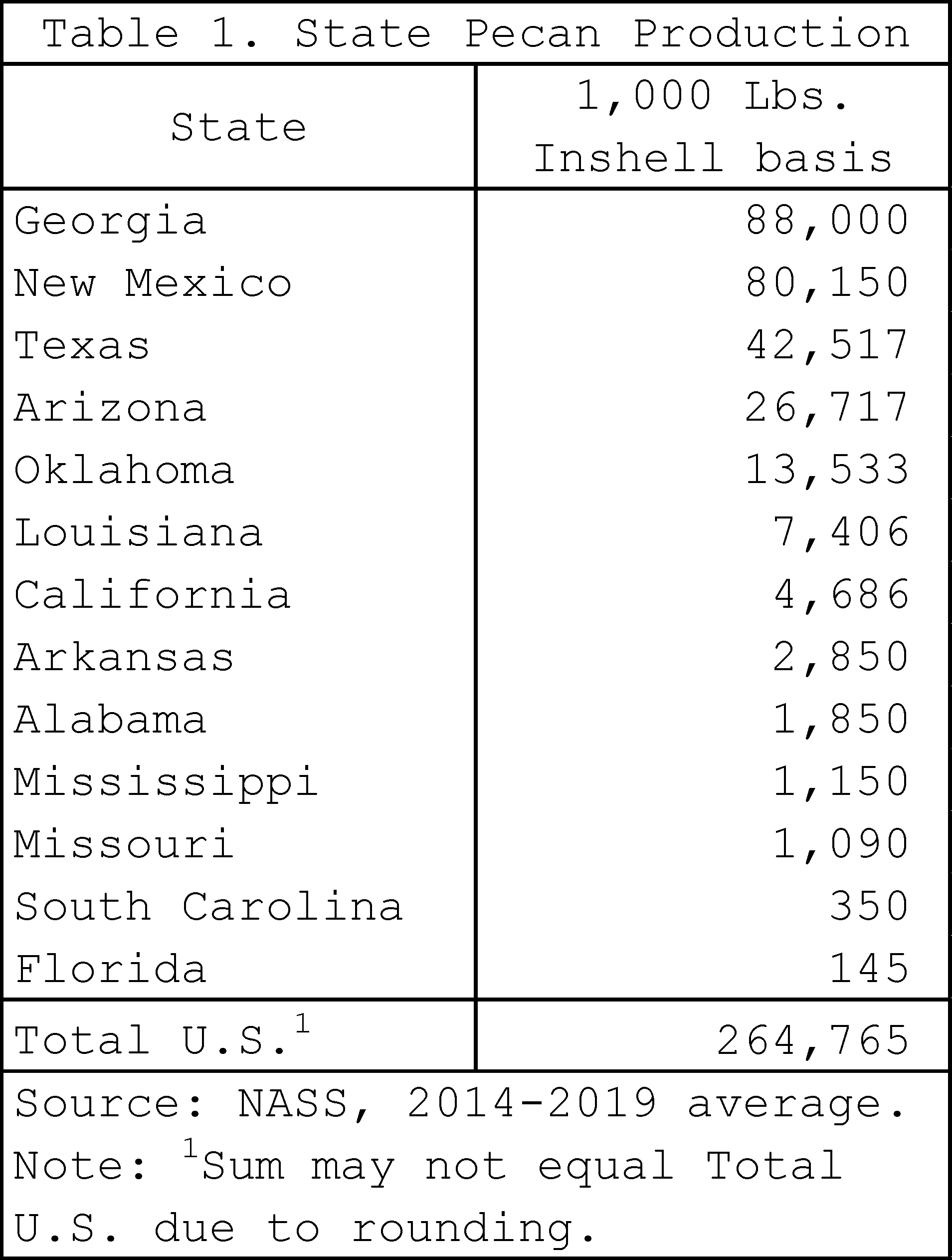 Pecans are an alternate bearing crop, causing variability in production from year to year. Based on data from the National Agricultural Statistics Service (NASS), the 2014 to 2019 six-year average of total U.S. pecan production was almost 265 million pounds on an inshell basis, as shown in Table 1. Together, Georgia and New Mexico produced more than half of pecan volume nationwide.