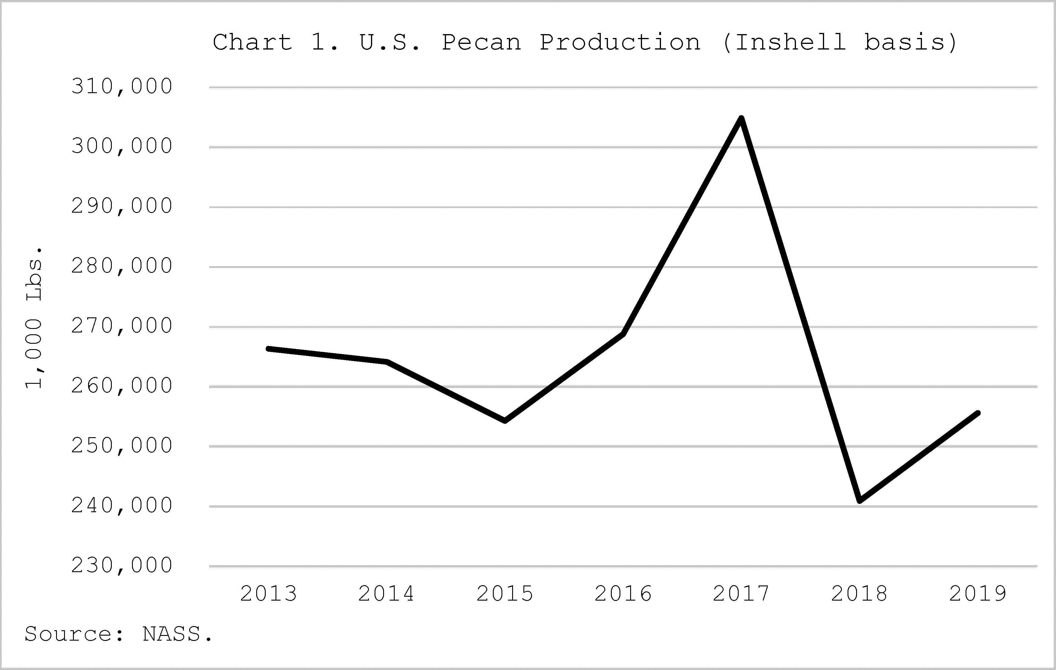 From 2013 through 2016, pecan production averaged about 263 million pounds per year, and reached a peak in 2017 at nearly 305 million pounds. The following year, however, domestic production dropped 21 percent due to the destruction of the Georgia pecan crop by Hurricane Michael. The trend of U.S. pecan production is depicted in Chart 1.