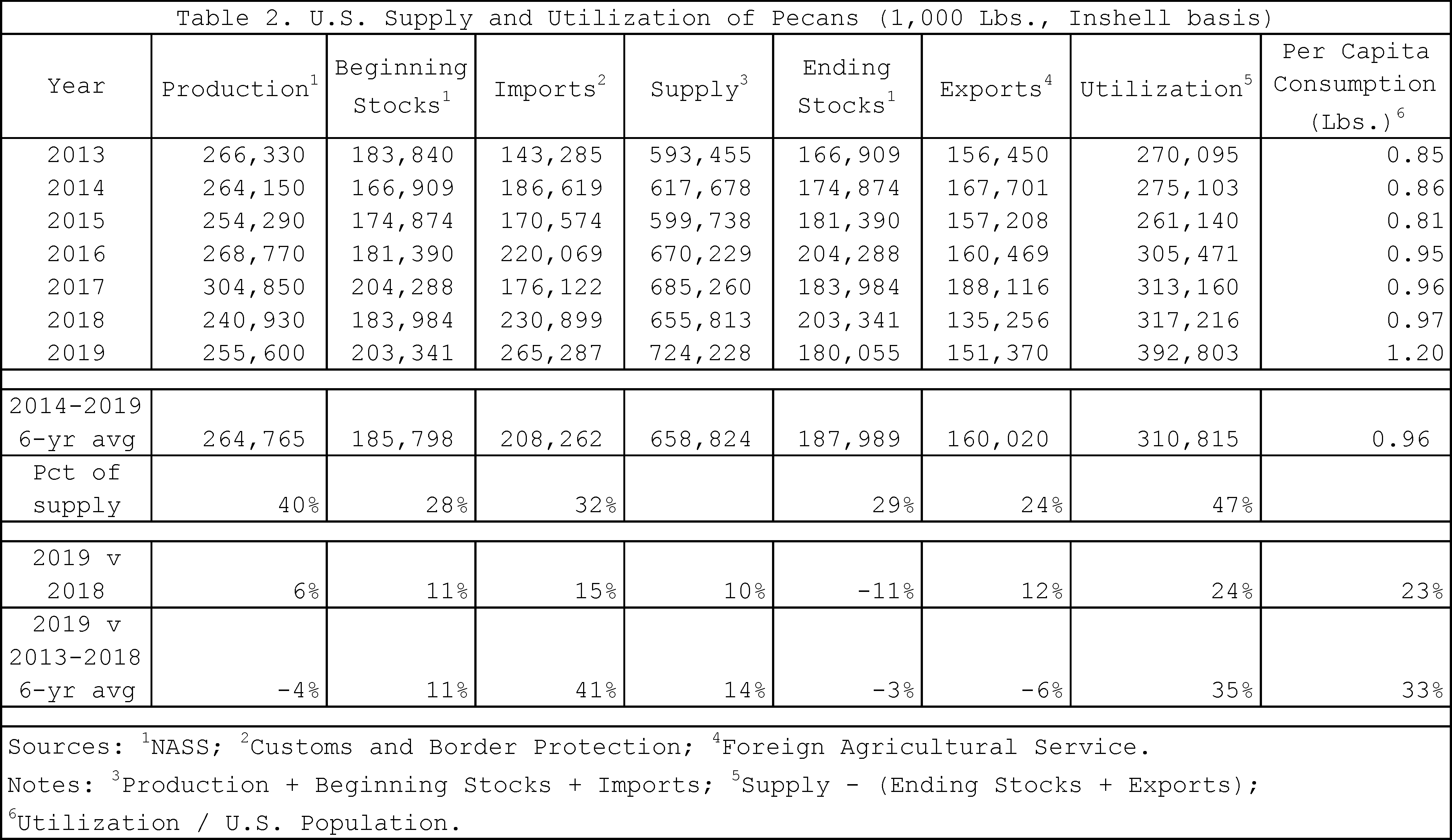 Table 2 shows U.S. pecan supply and utilization. Domestic production generally accounts for about 40 percent of the domestic supply, while imports account for nearly one-third, with beginning stocks just under 30 percent. Almost all pecans imported into the U.S. are from Mexico. Of these, 70 percent are shelled, and 30 percent are inshell.