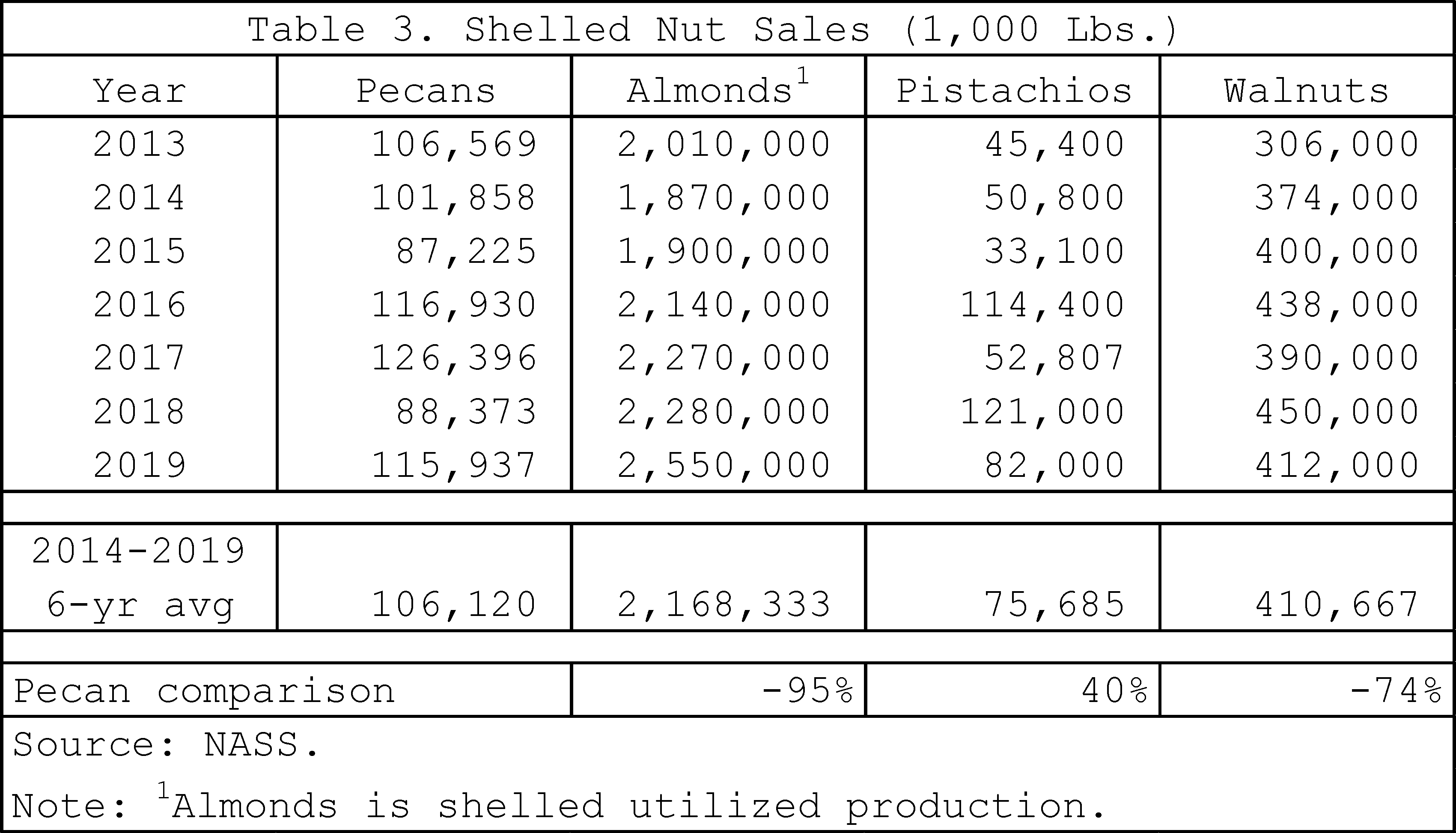 The pecan industry competes with other tree nut industries such as almonds, pistachios and walnuts. As Table 3 illustrates, sales by volume of pecans are 95 percent lower than sales of almonds, 74 percent lower than sales of walnuts, but 40 percent higher than sales of pistachios.