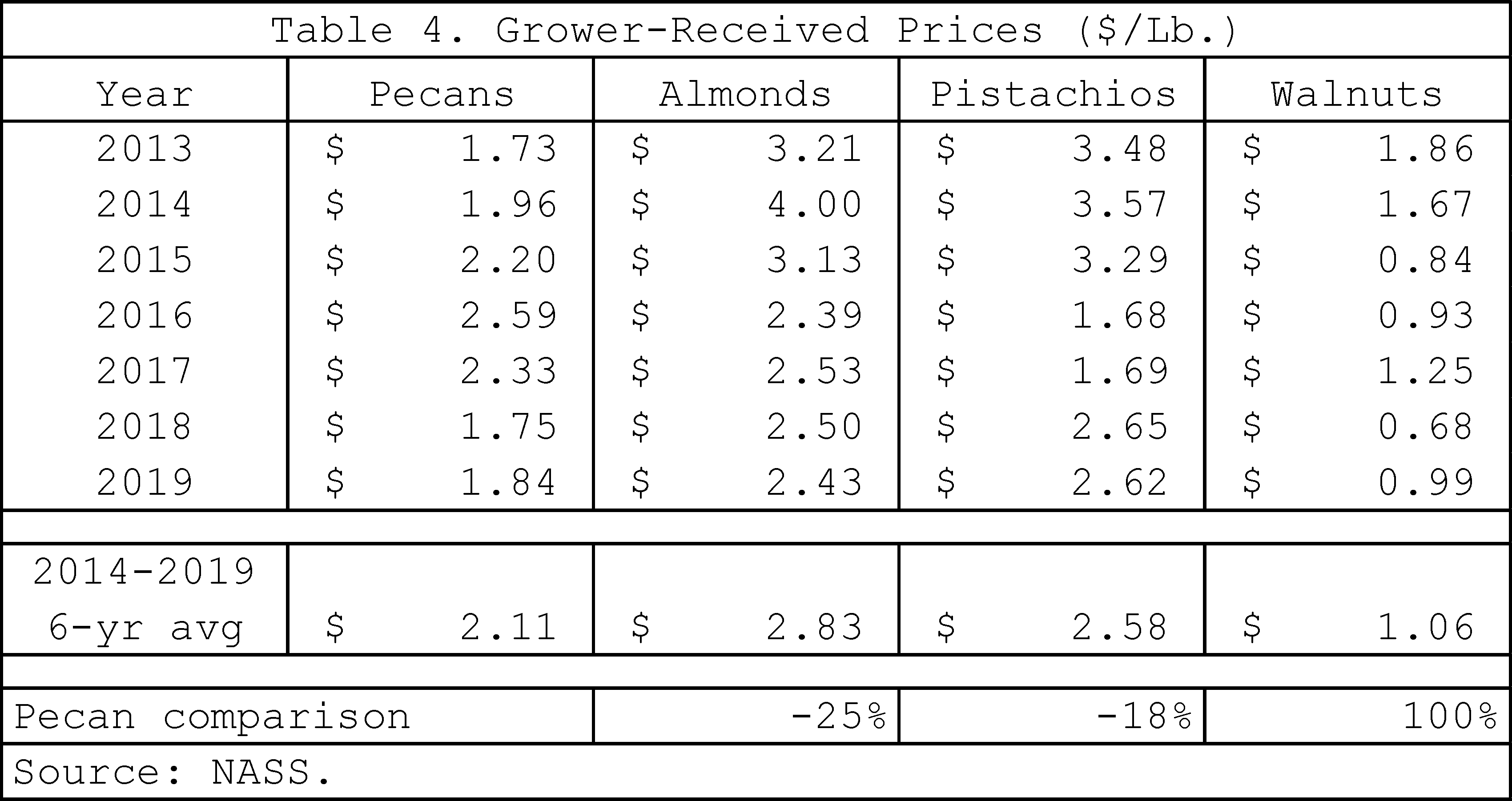 Prices received by growers, as shown in Table 4, are 25 percent lower for pecans than for almonds. Compared to other nuts, grower-received prices for pecans are 18 percent lower than those for pistachios, but double those for walnuts.