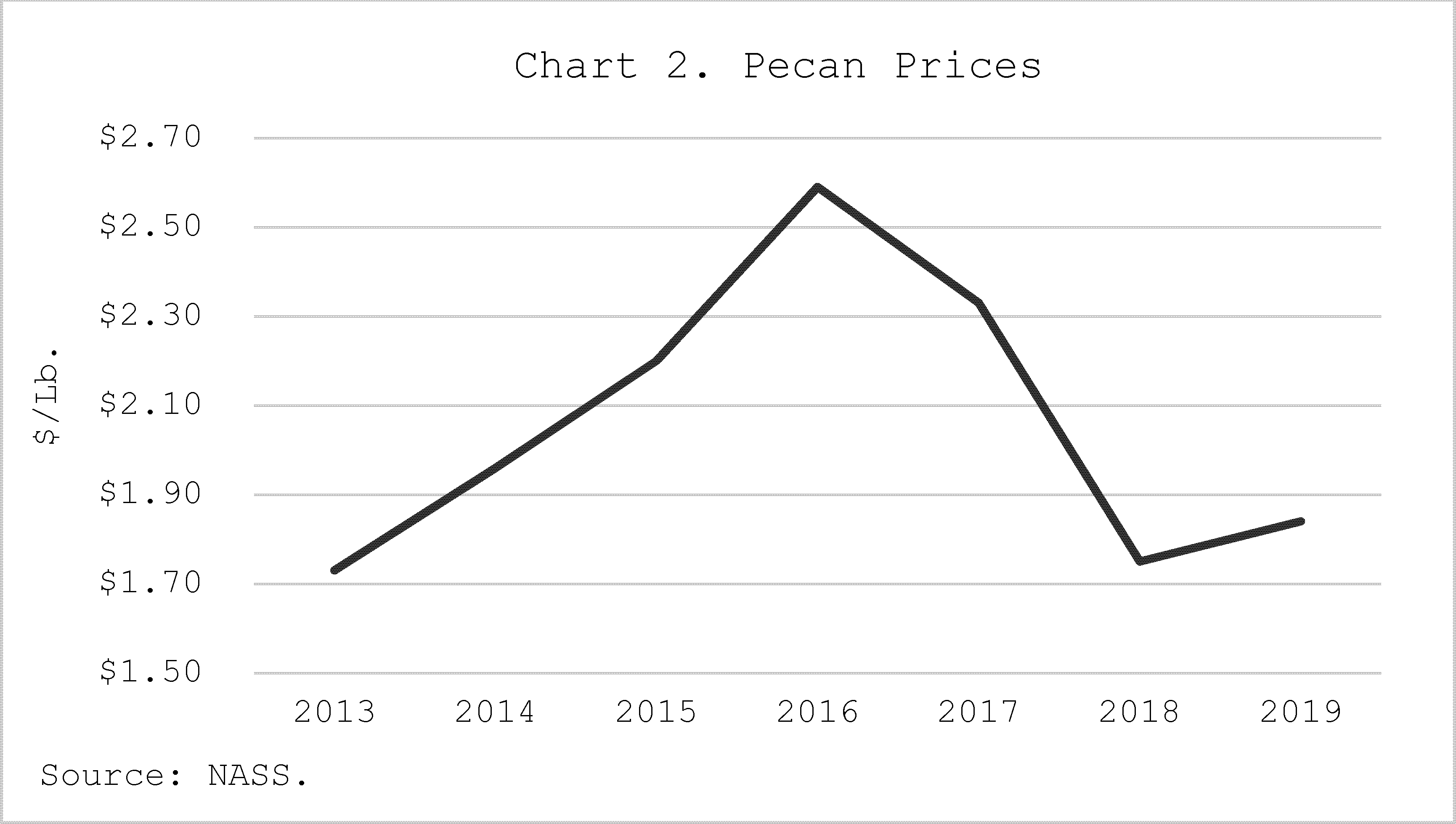 Chart 2 shows the trend of prices for pecans from 2013 to 2019. In recent years, pecan prices were at their highest in 2016 before dropping in the following two years. Prices increased slightly between 2018 and 2019 but are still down about 12 percent compared to the average of the previous six years.