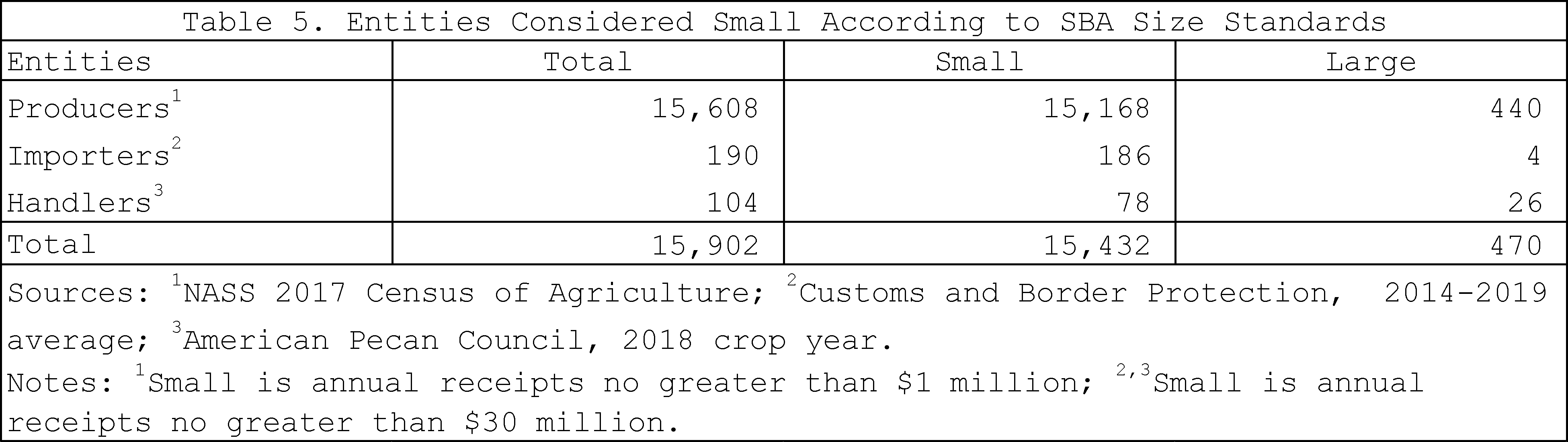 Importers and first handlers of inshell and shelled pecans (HTS Codes 0802901000 and 0802901500, respectively) belong to the industry classification of Postharvest Crop Activities (NAICS Code 115114). “Postharvest crop activities” include nut hulling and shelling, sorting, grading, packing, and cooling. An operation that meets this definition is considered to be “small”, per the SBA, if its annual receipts equal no more than $30 million. Table 5 depicts the number of pecan producers, importers, and handlers that would be considered small under these SBA standards.