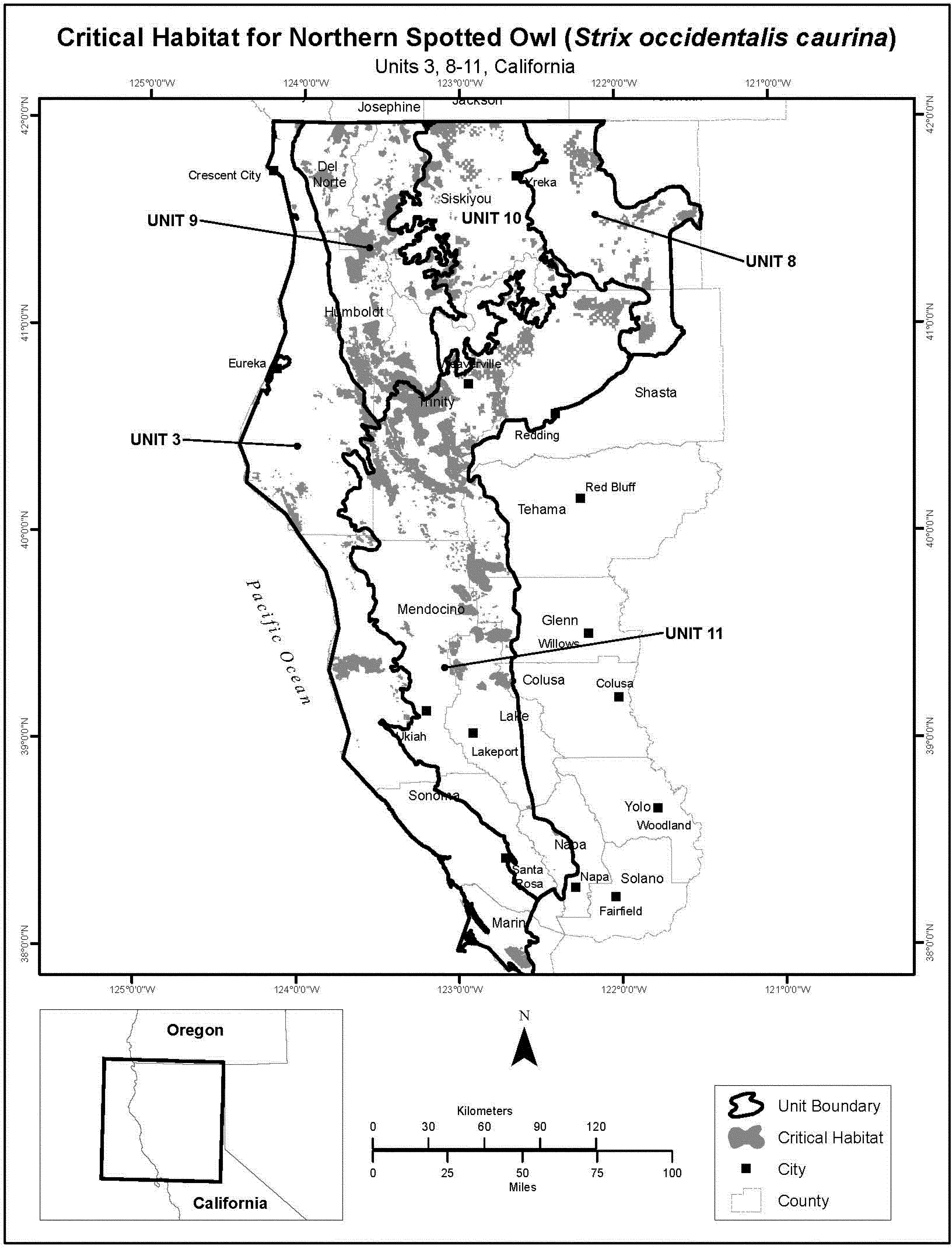 Index map of critical habitat units for the northern spotted owl in the State of California follows: