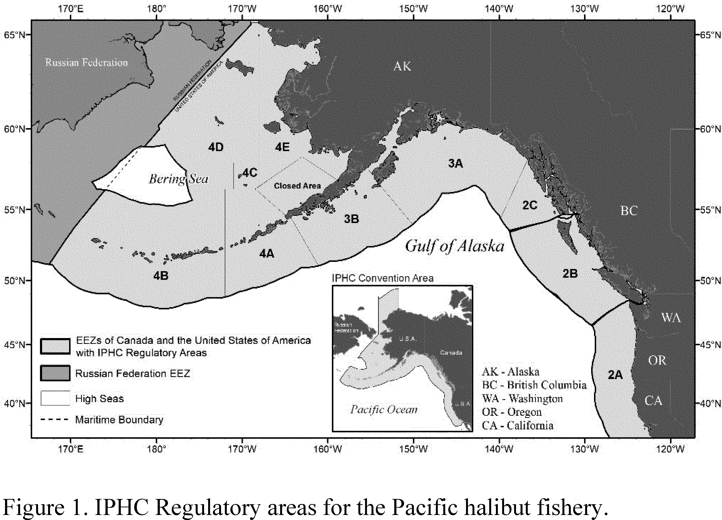 The IPHC apportions catch limits for the Pacific halibut fishery among regulatory areas (Figure 1): Area 2A (Oregon, Washington, and California), Area 2B (British Columbia), Area 2C (Southeast Alaska), Area 3A (Central Gulf of Alaska), Area 3B (Western Gulf of Alaska), and Area 4 (subdivided into 5 areas, 4A through 4E, in the Bering Sea and Aleutian Islands of Western Alaska).