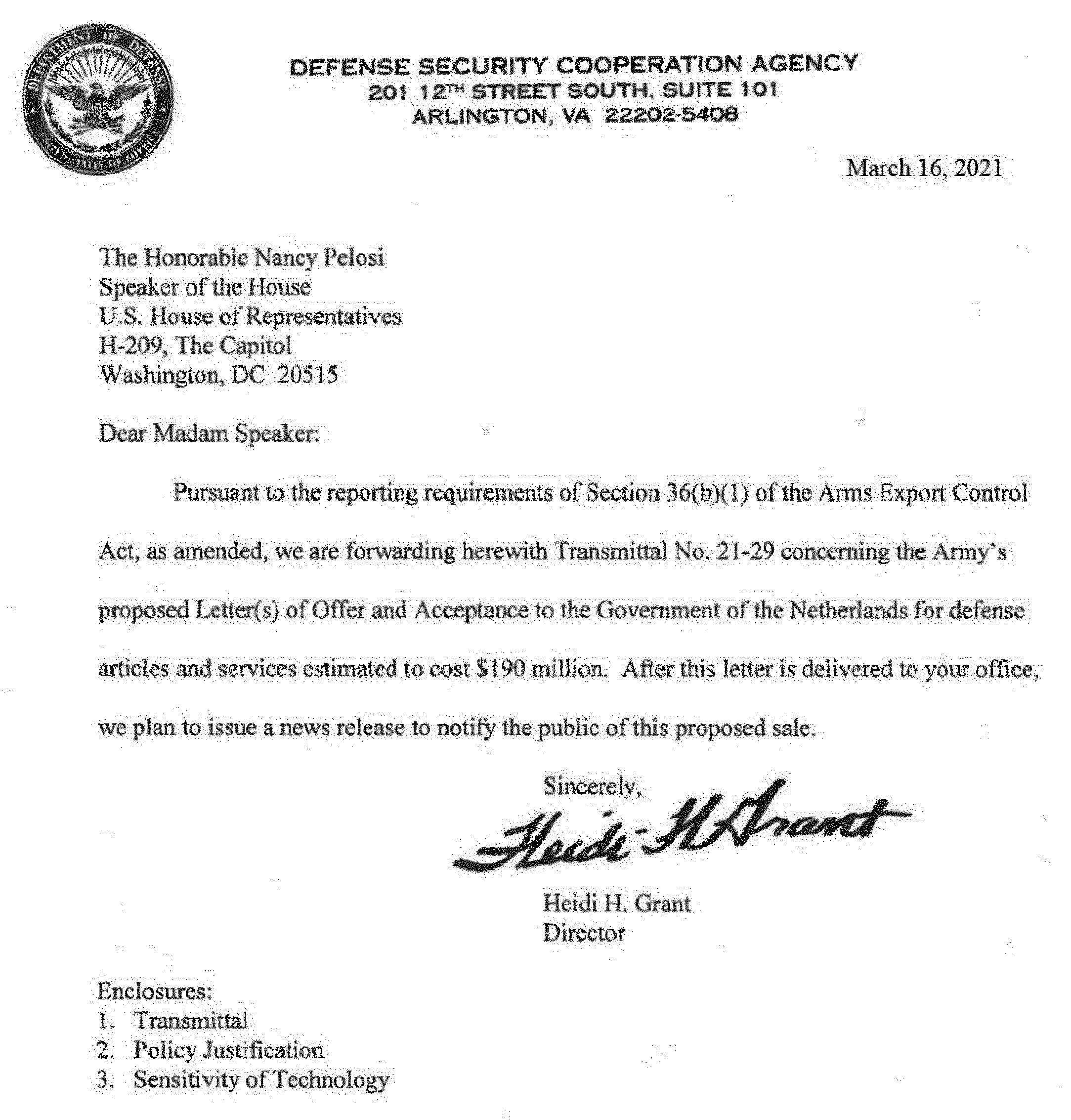 This 36(b)(1) arms sales notification is published to fulfill the requirements of section 155 of Public Law 104-164 dated July 21, 1996. The following is a copy of a letter to the Speaker of the House of Representatives, Transmittal 21-29 with attached Policy Justification.