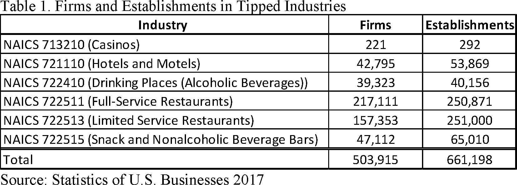 The Department limited this analysis to a few industries that were acknowledged to have tipped workers in the 2020 Tip final rule. These industries are classified under the North American Industry Classification System (NAICS) as 713210 (Casinos), 721110 (Hotels and Motels), 722410 (Drinking Places (Alcoholic Beverages)), 722511 (Full-service Restaurants), 722513 (Limited Service Restaurants), and 722515 (Snack and Nonalcoholic Beverage Bars). The SUSB reports that these industries have 503,915 private firms and 661,198 private establishments. Of these, 501,322 firms and 554,088 establishments have fewer than 500 employees.
