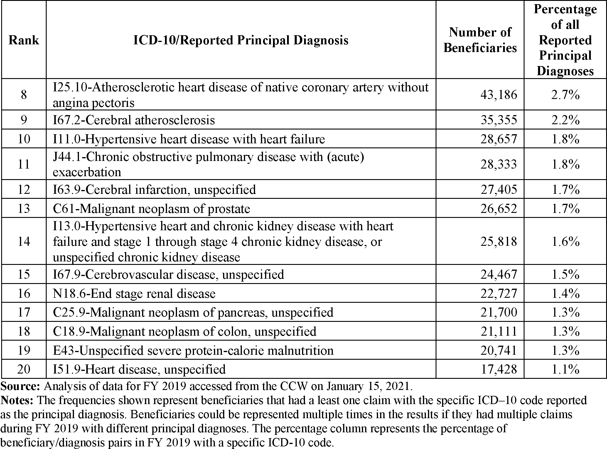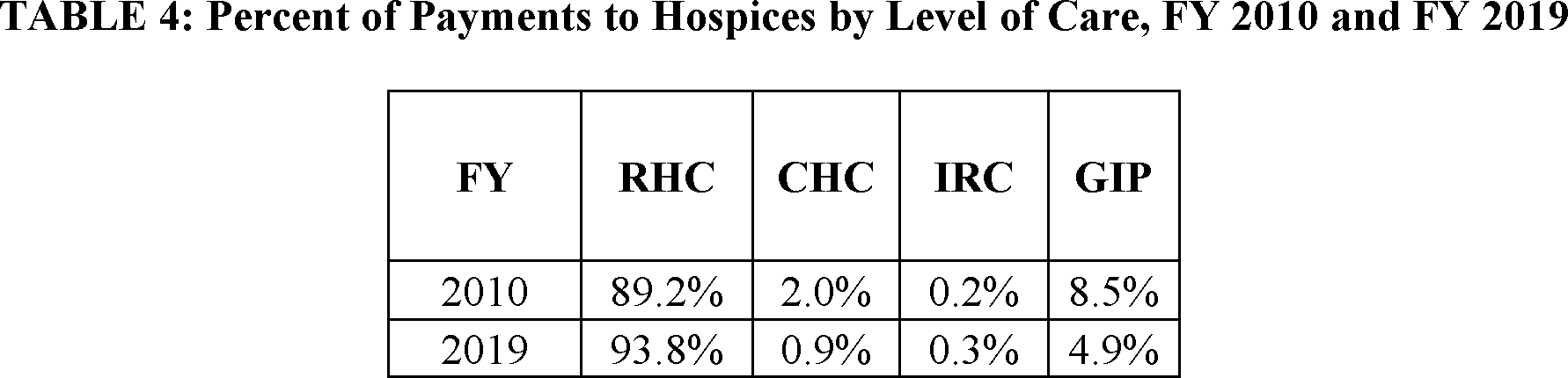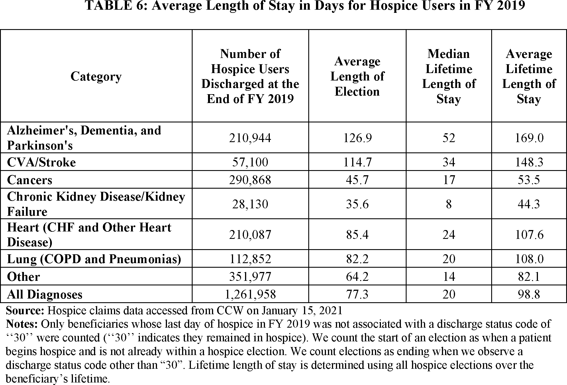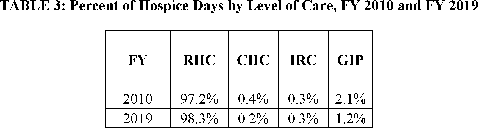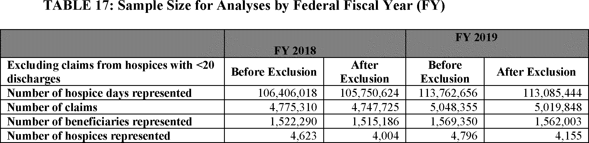 Another exclusion was made prior to reporting the numbers in Table B.1. We exclude all claims for a beneficiary if a beneficiary ever had two overlapping hospice days on separate claims. For FY 2019 this removes 5,212,319 hospice days that come from 218,420 claims and 33,009 beneficiaries.